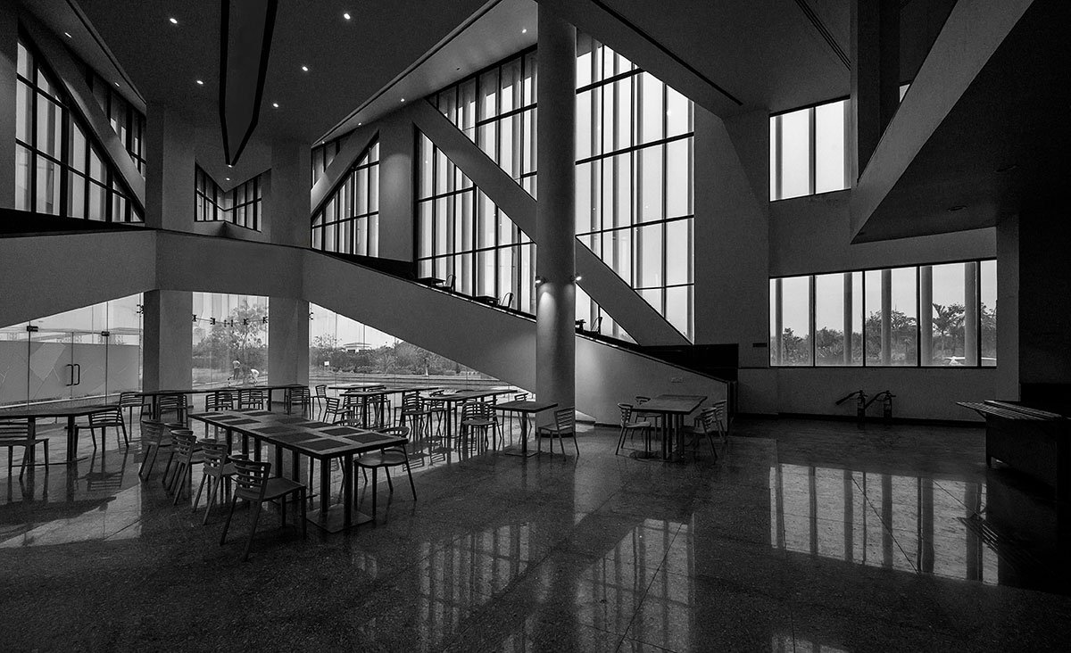 The building shape generates its longest sides oriented towards the north, with angled louvres on the other faces directing the internal spaces northward. The orientation allows indirect light throughout the day into all of the internal spaces, rendering the building energy efficient.