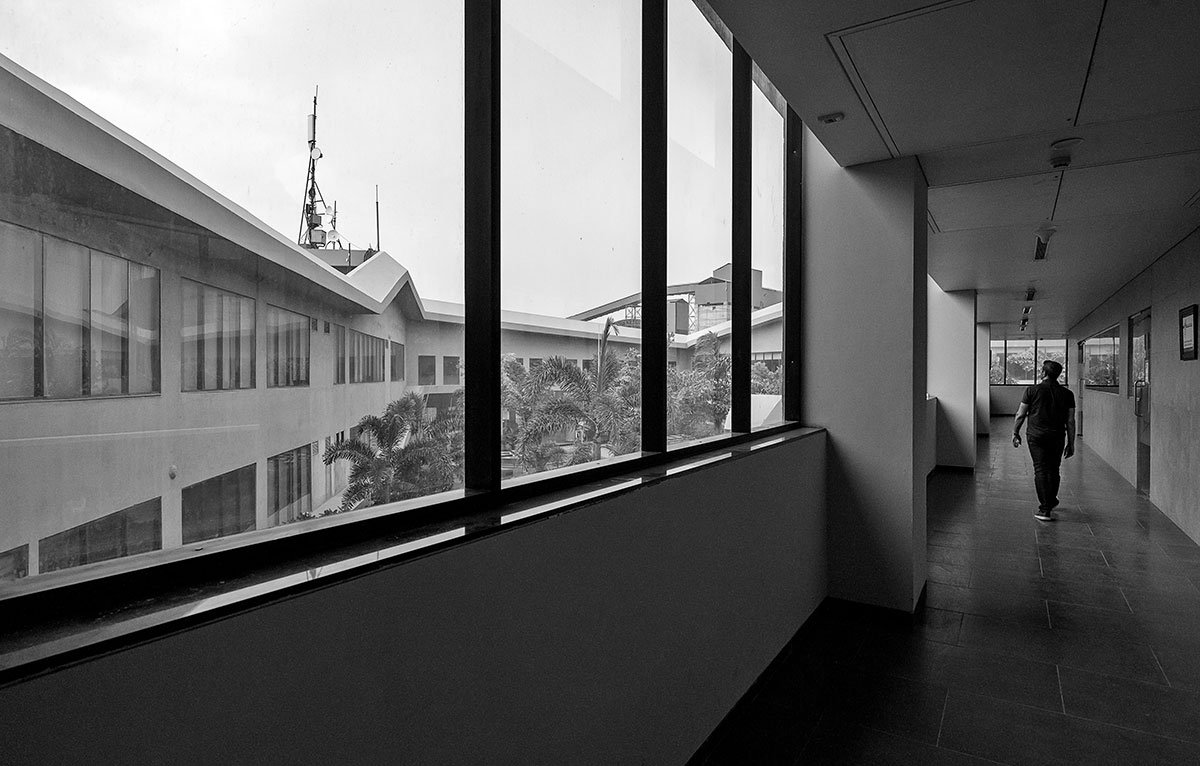 The northeast and northwest corners of the building are also lifted, creating singular large volumes at both ends to allow visual contact between floors, where a cafeteria and a library are housed.