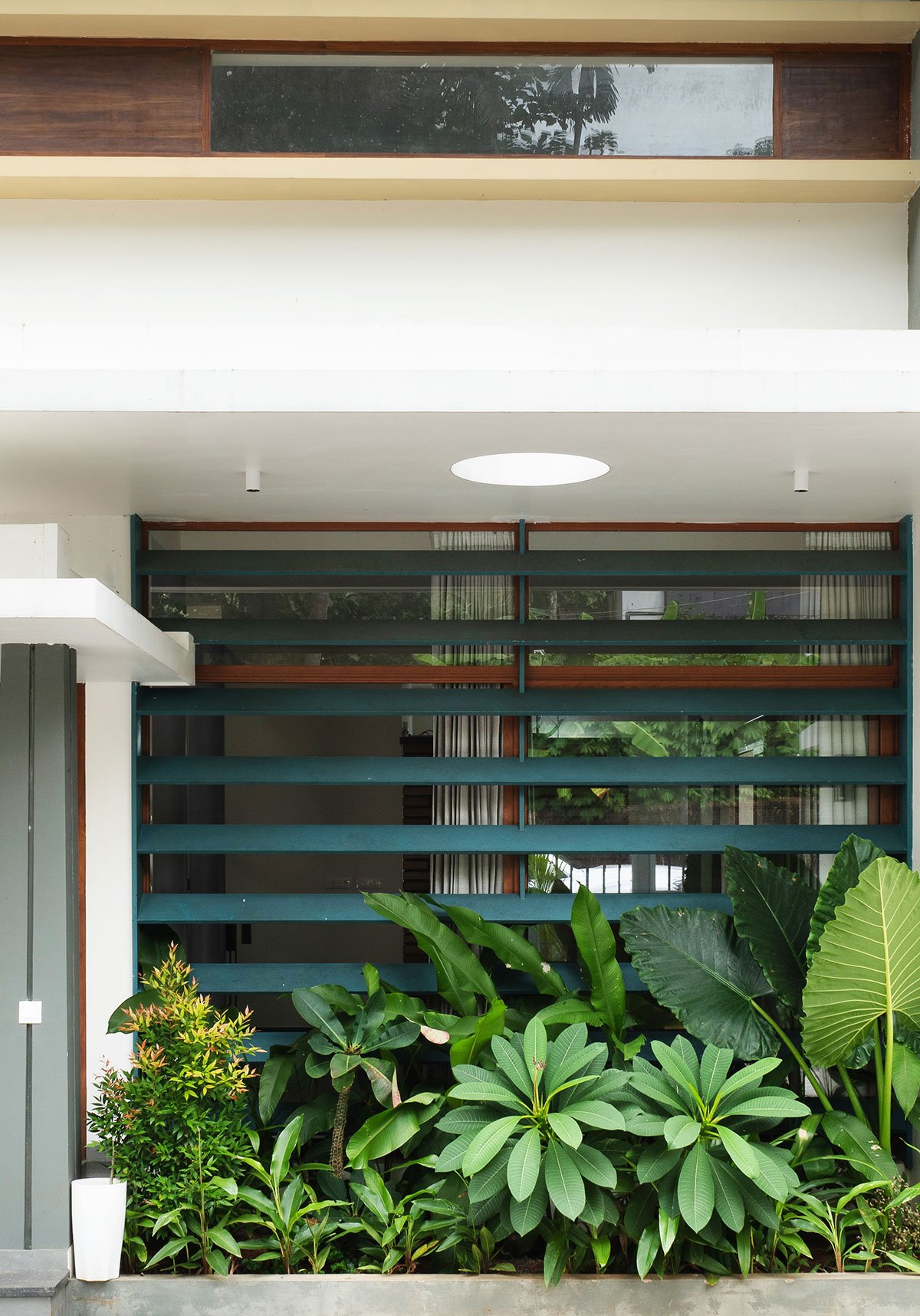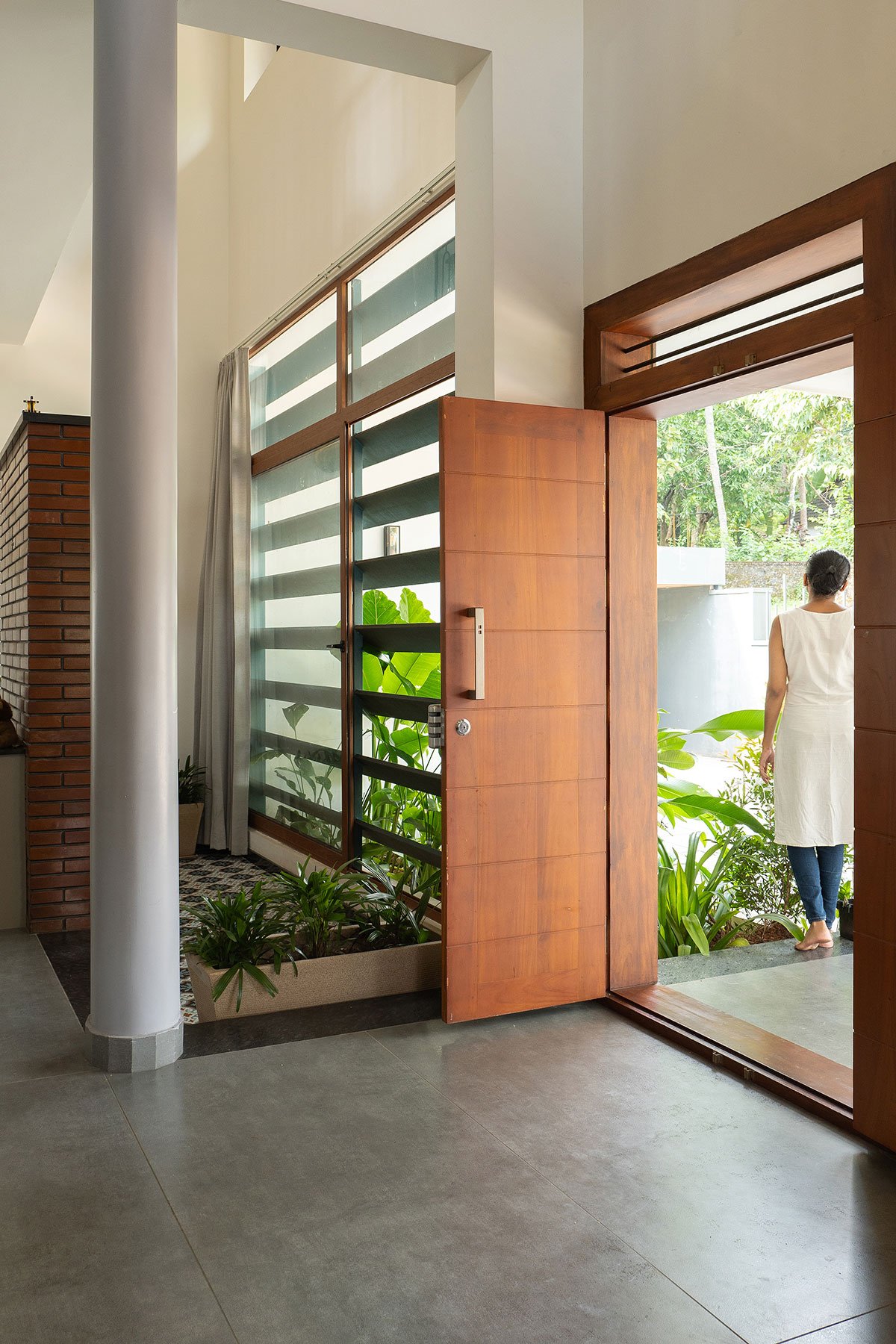 The facade is flanked by fixed louvers and clerestory windows at different levels to cut the direct entry of sunlight thus acting as a buffer for the main functional spaces. The elevation thus strikes a balance between solidity and transparency. A shift in material from brick to exposed gray concrete distinguishes this volume. This concept of boxes is then taken further while developing the overall design language.