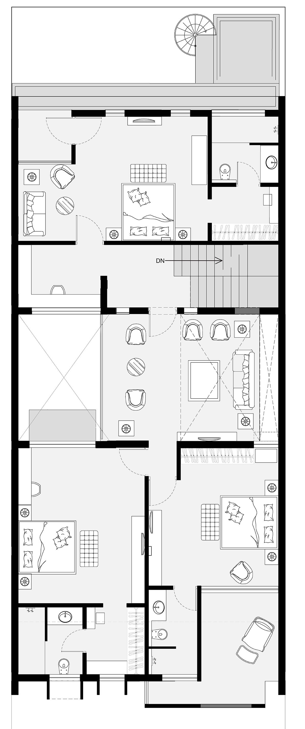 CONCEPT: The house, being southwest-facing, was imagined to be a largely inward-looking house that offers multiple experiences within. The 90-foot depth of the plot was used to its advantage by creating a wall around the periphery and keeping the central part open. The idea was to create an oversized cocoon as an archetype where one enjoys a large enclosure.