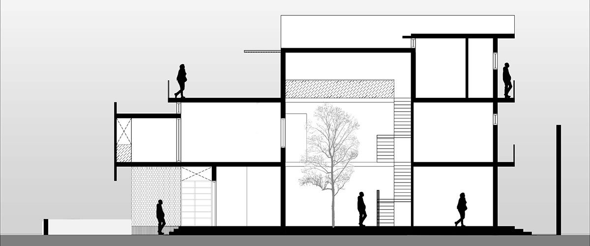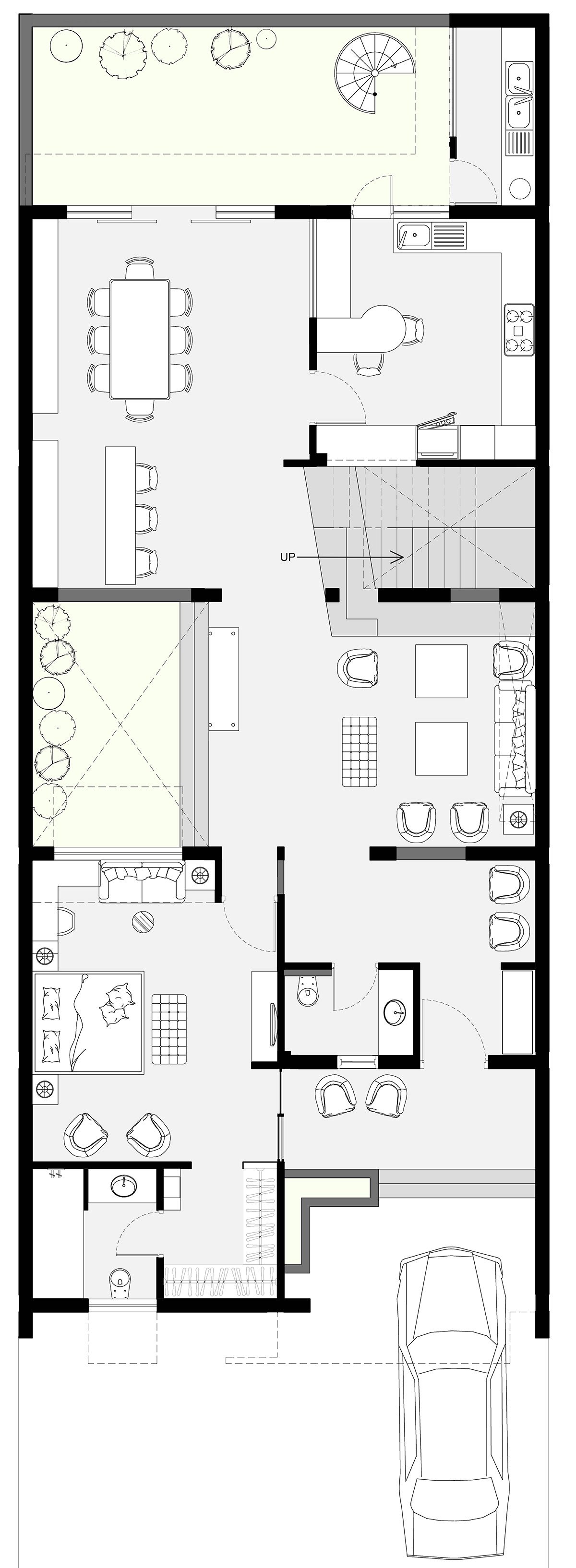 The length of the plot was used to enhance the unfolding experience. The entrance is planned from the southwest corner into a foyer space, and one’s vision travels straight onto the diagonally opposite corner, getting clues about the greens in the backyard. Then there are a set of planes that appear to unfold the spaces in between. The light of the central courtyard makes one move towards it and arrive in the middle of the site width, with a sunken courtyard flooded with natural light on one side and a relatively dark seating arrangement with a beam of light from a linear skylight on the other.