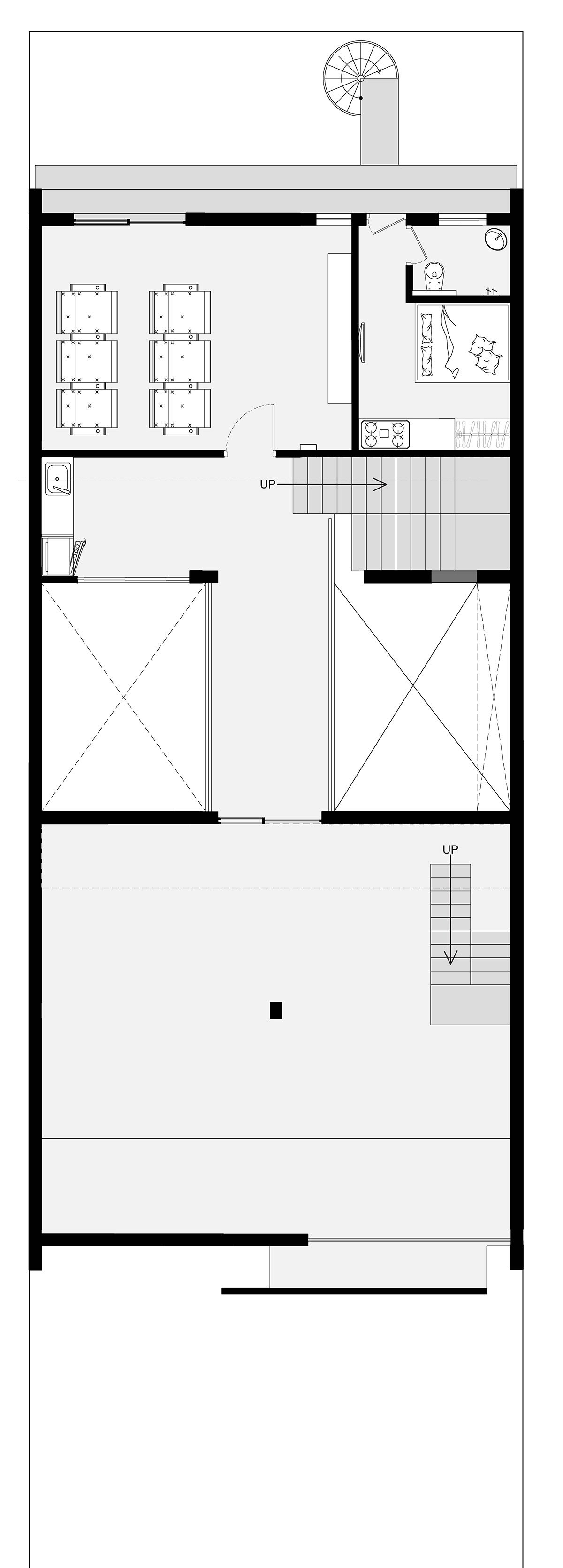COURTYARD: The sunken courtyard has a bar behind one plane with a cut-out that allows one to connect to the court space from the bar area. The only bedroom on the ground floor towards the front side has one window opening towards the courtyard that receives the natural light from the court space. The other is towards the entrance verandah.