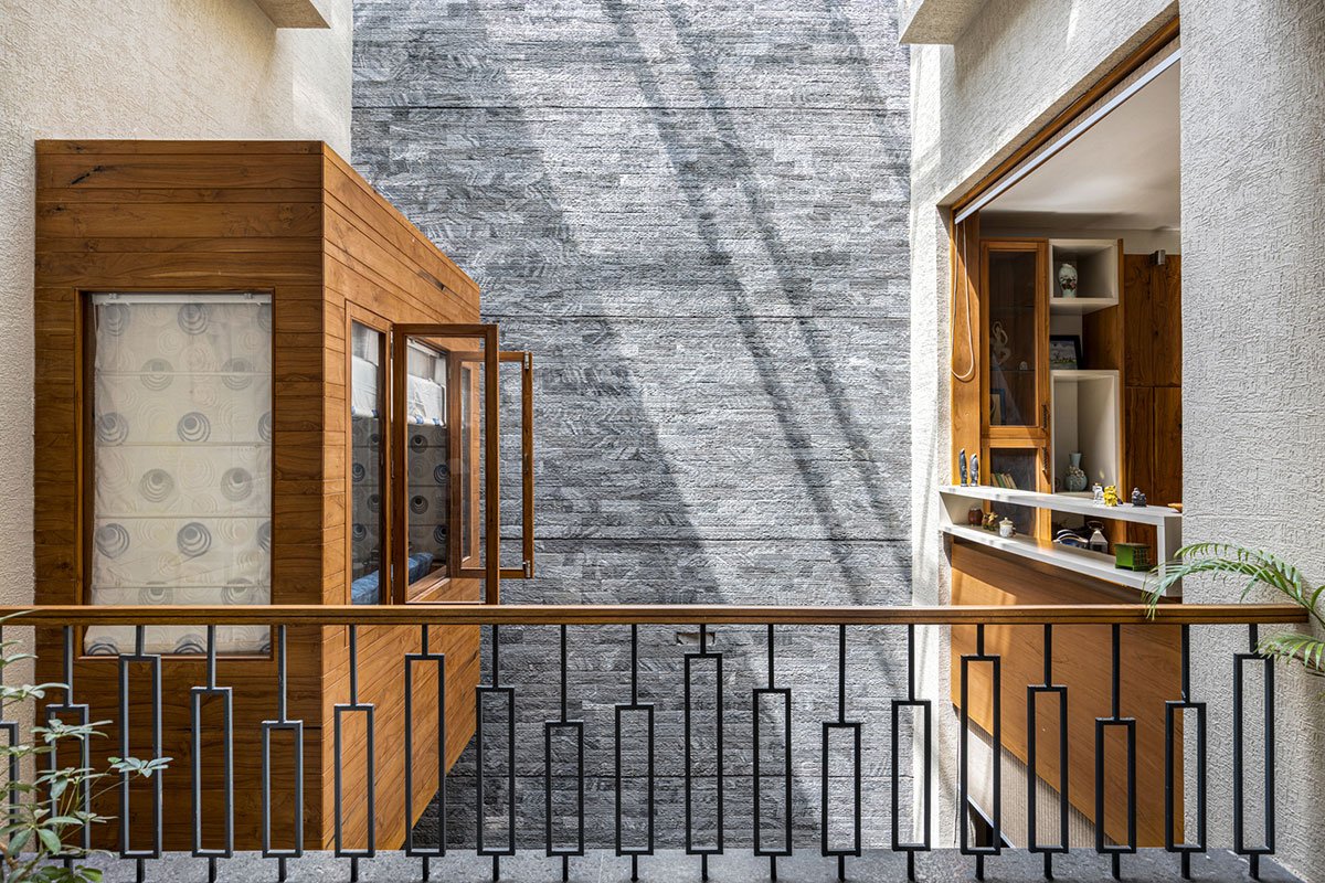 Block THE South West : The house is a southwest-facing unit and receives the harsh summer sun for six months of the year. In order to make it passively cool, the services like the toilets and the wardrobe spaces were positioned on the front side to block the southwest sun and keep the interiors cooler. As a result, both the bedrooms towards the west corner of the two levels receive natural light from the courtyard space. The first-floor toilets were kept at a low height to allow some more natural, filtered light between the slabs through glass bricks.
