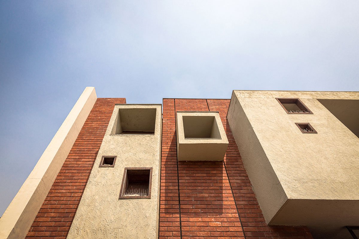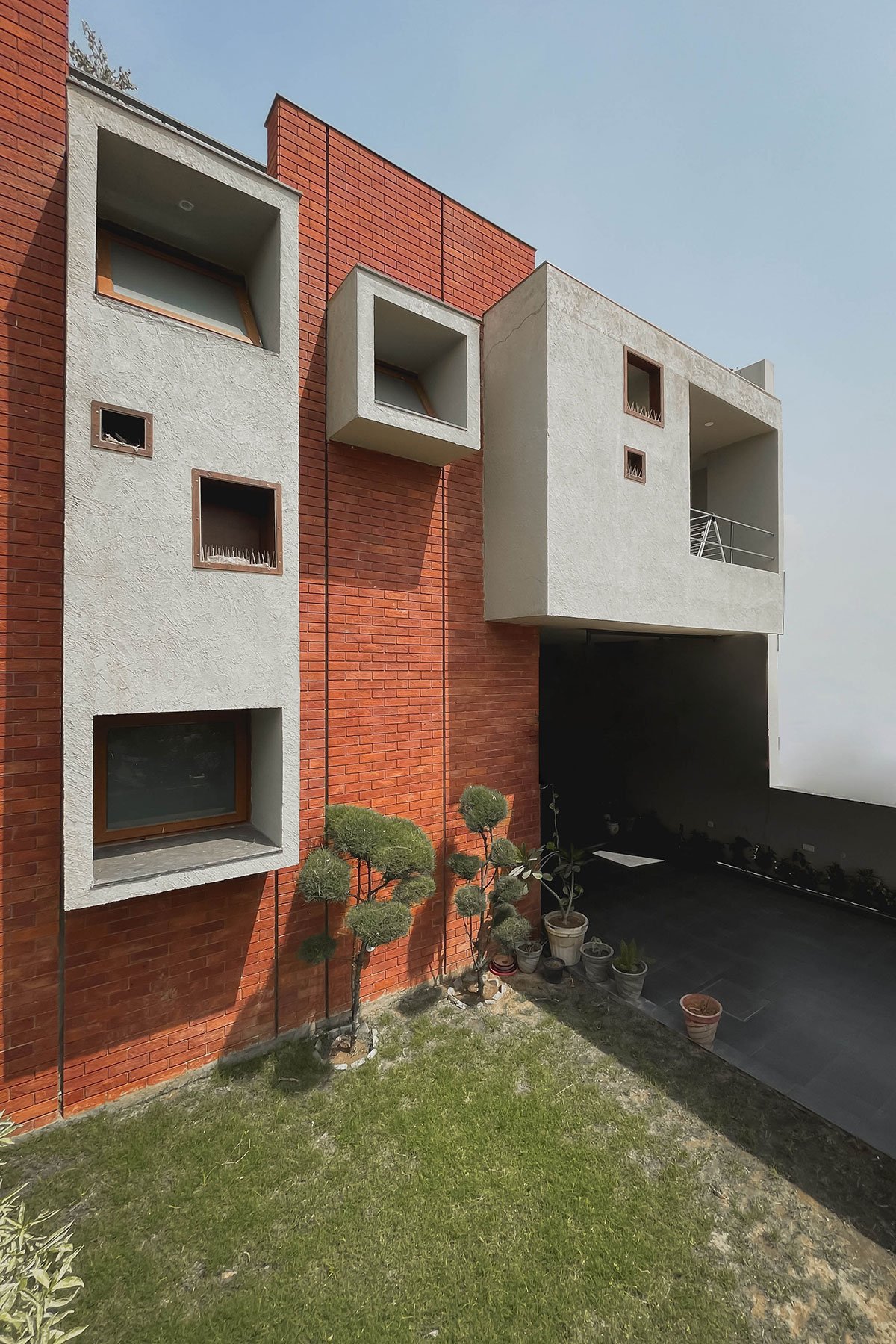 RECESSED OPENINGS AND FACADE: The harsh natural light from the southwest was controlled by deepening the verandah spaces to create shaded spaces during the summer and also enjoy the winter sun during the late afternoons. The openings in the toilets have also been recessed and given a form following the square as the basic shape. The hollow cube of the upper-level verandah in connection with the square openings of the toilets allowed us to create an expression of planes in interaction with the protruding boxes. The use of brick cladding gave a hint of the context the house was sitting in.