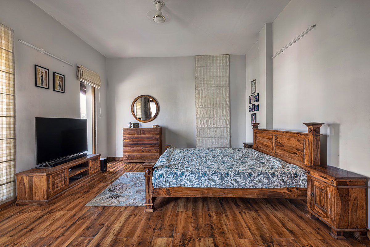 Excerpt: The Khosla couple sought a house reflecting their lifestyle and sustainability. The large plot size was a challenge, but the design by Forumadvaita resembled a southwest-facing cocoon, offering multiple experiences. The 90-foot depth created a wall around the periphery, while diagonal routes and framed openings enhanced the unfolding experience. Services like toilets and wardrobe spaces were positioned on the front side, while recessed openings and facade controlled natural light. The hollow cube of the upper-level verandah and square openings allowed planes to interact with protruding boxes. Brick cladding added context to the house.