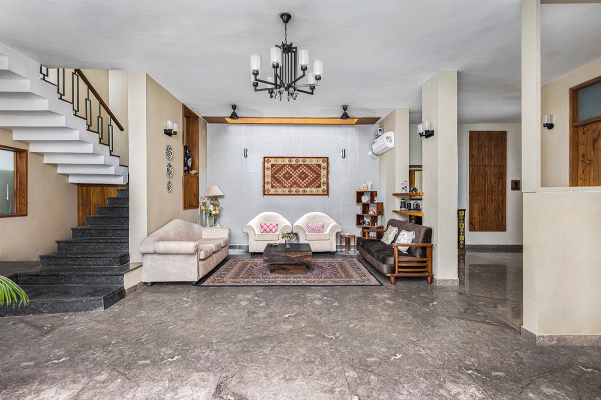 The formal seating adjacent to the internal staircase is also separated by a plane with a cut-out that offers framed views from the other side and also leads one to the upper level. where the second step is shaped to be tapered to communicate the idea of opening up the diagonal route. This further leads one towards the Bar and dining area, with the last plane unfolding into the kitchen area. These multiple framed openings allowed the users to exhibit their belongings from their travels.