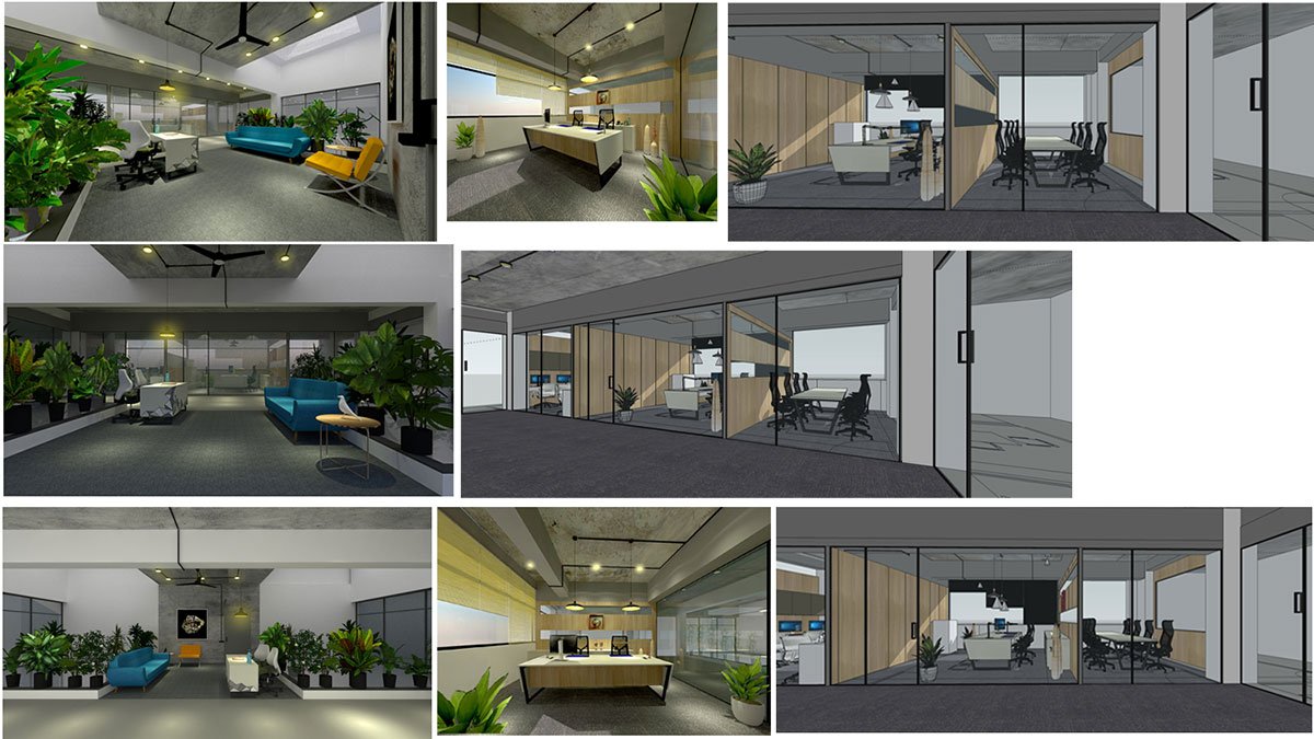 The area is 4,380 sqft. occupied with 1. Public space zone [ Reception and waiting zone]. 2. Semi-public zone [ main executive, conference] and 3. Private zone [Production area 1 and Production area-2].