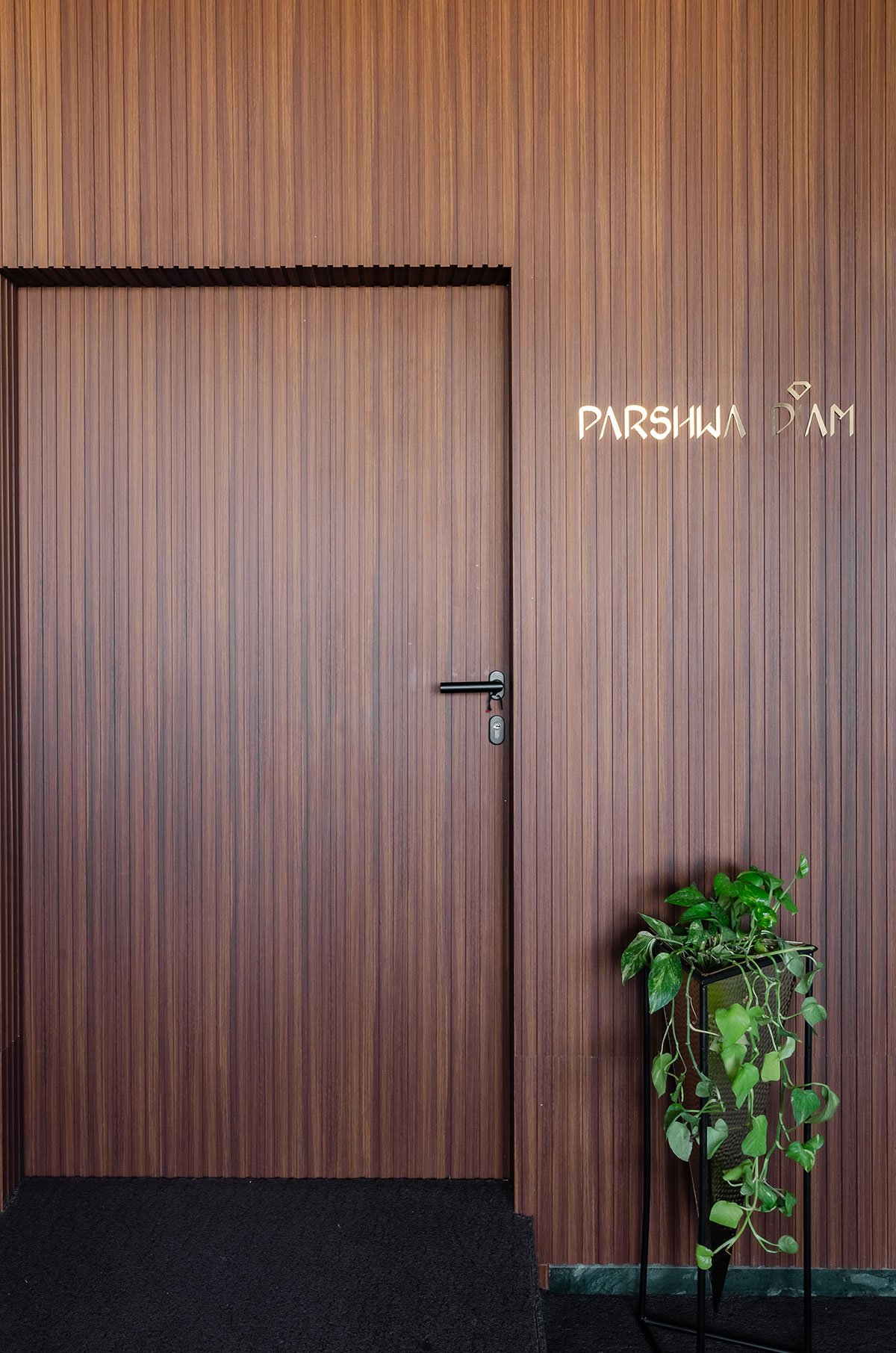 The main access wall skin is covered with reusable fluted PVC module panels that give a firewood feel. Furthermore, the brushed brass logo and the plant added to its grandeur.