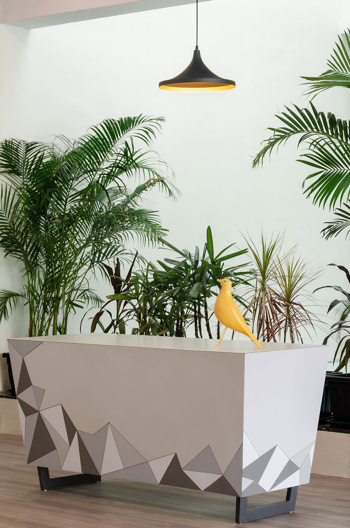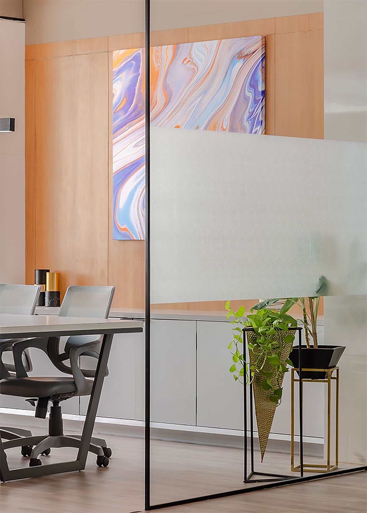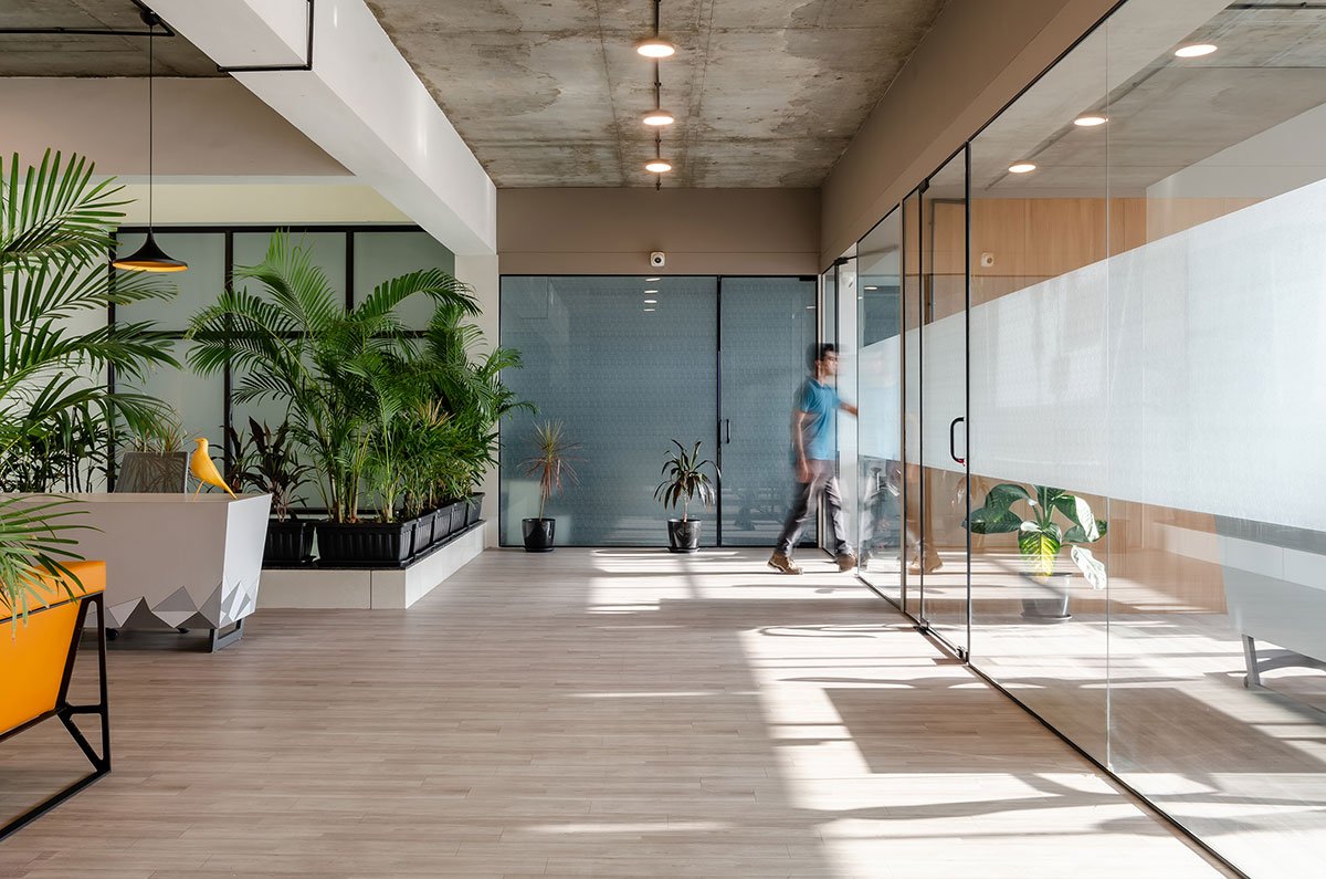 Upon entering the premise, you feel the flora gallery where you are greeted by the abundant touch of the sun’s rays and the various shrubs. This is not just an office; this is a manmade ‘tiny jungle’ which is adorned with an art canvas and sculpted furniture. The vinyl floor surface gives a seamless visual and maintains the spaciousness of the whole area. The hallway is lit up with plentiful sun rays which are connected to a lead thin-frame glass partition layer which makes you feel like you are standing outside in the greenery as the sun’s rays are spread evenly at every corner. All cabins are completely transparent but also maintain privacy using minimal obstruction. Seating in a waiting lounge makes you feel like you are in a park; an informal lounge makes you feel open. Minimally, an executive space gives a soothing as well as homely feel with lavish green.