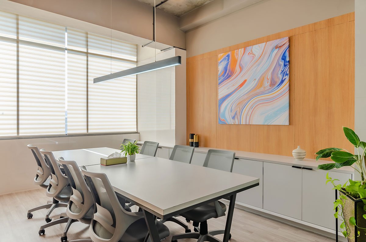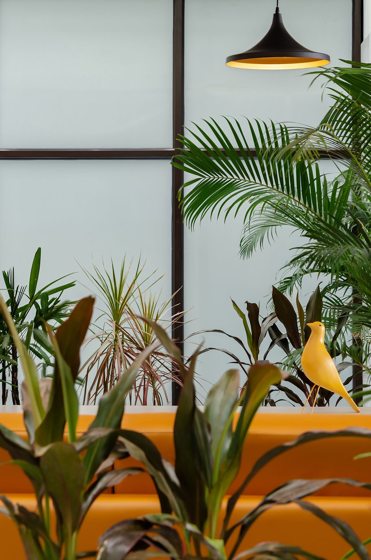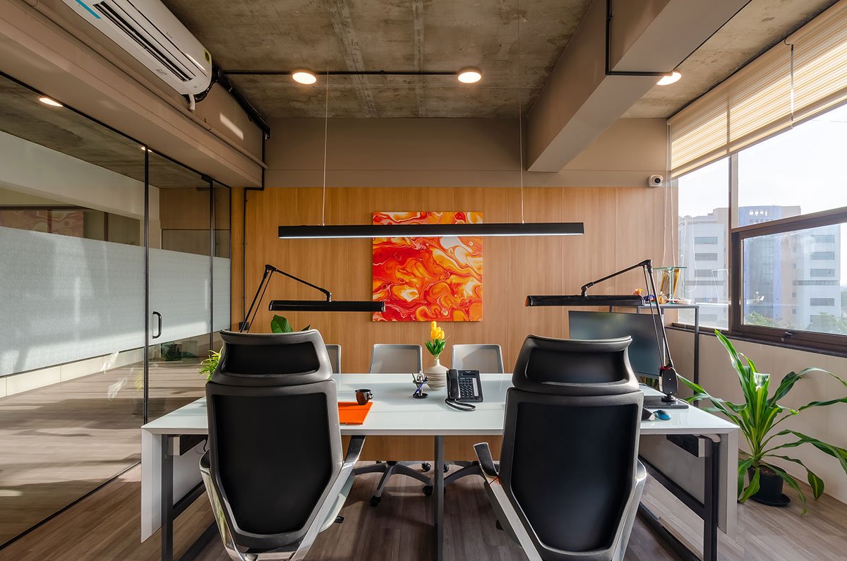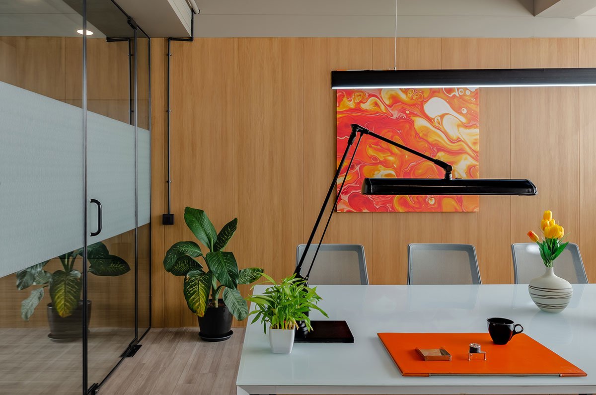 Upon entering the premise, you feel the flora gallery where you are greeted by the abundant touch of the sun’s rays and the various shrubs. This is not just an office; this is a manmade ‘tiny jungle’ which is adorned with an art canvas and sculpted furniture. The vinyl floor surface gives a seamless visual and maintains the spaciousness of the whole area. The hallway is lit up with plentiful sun rays which are connected to a lead thin-frame glass partition layer which makes you feel like you are standing outside in the greenery as the sun’s rays are spread evenly at every corner. All cabins are completely transparent but also maintain privacy using minimal obstruction. Seating in a waiting lounge makes you feel like you are in a park; an informal lounge makes you feel open. Minimally, an executive space gives a soothing as well as homely feel with lavish green.