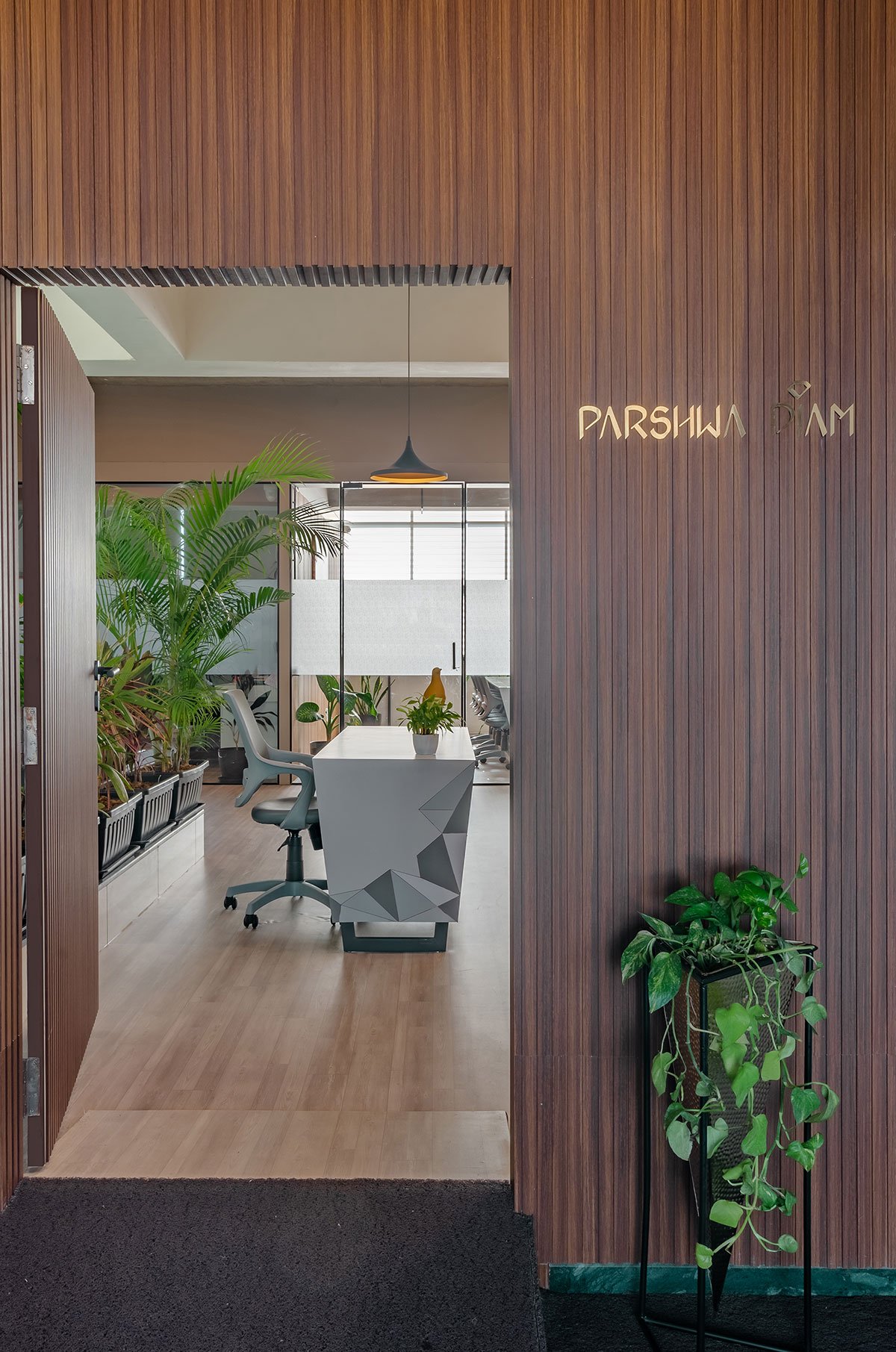 Excerpt: An office for a diamond factory, designed by Kritnam Atelier, is a blend of rustic themes based on the idea of living with nature. The design is a manmade ‘tiny jungle’, which is adorned with an art canvas and sculpted furniture. The whole office chracterises as an executive space that gives a soothing as well as homely feel with lavish green.