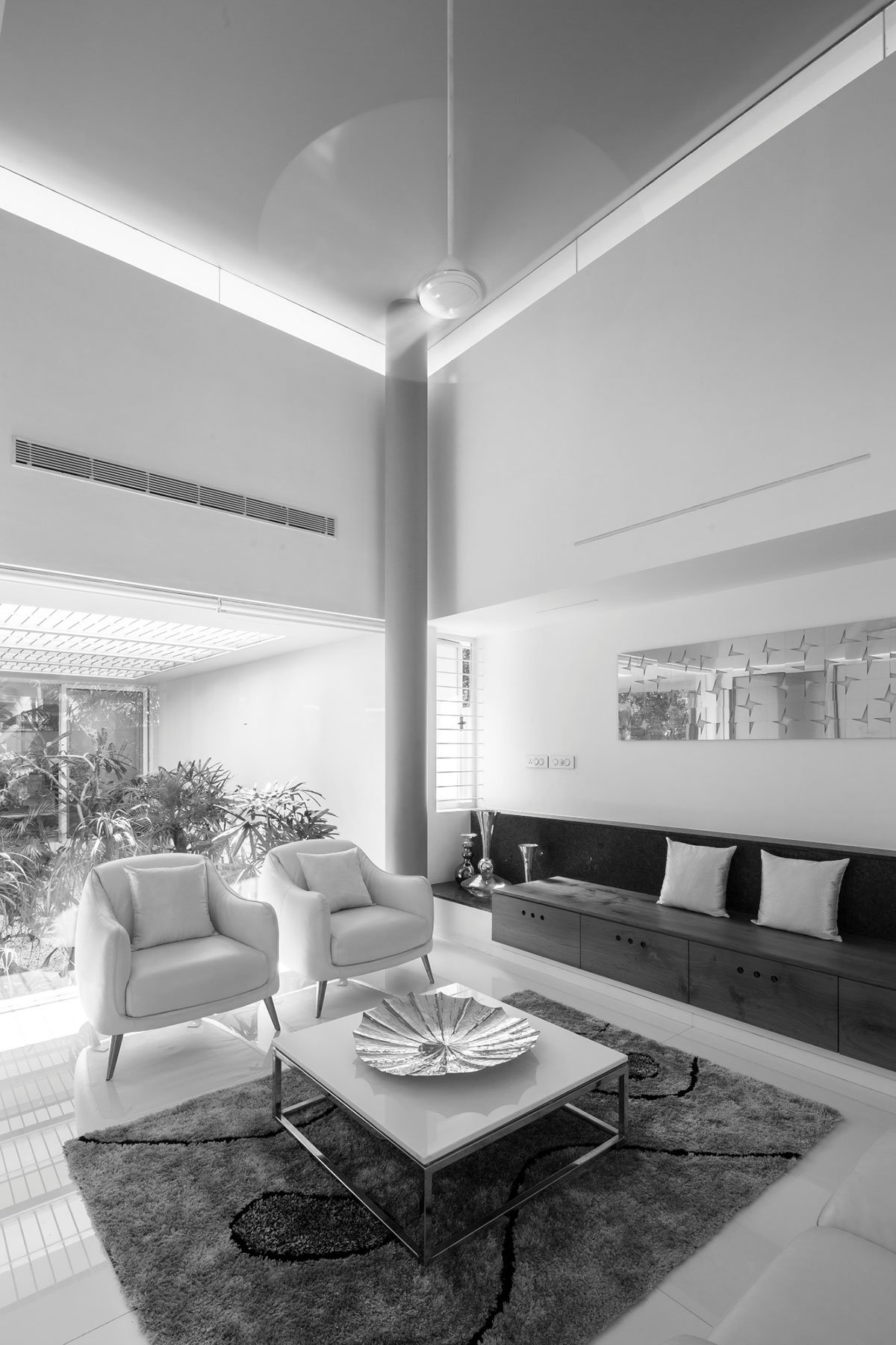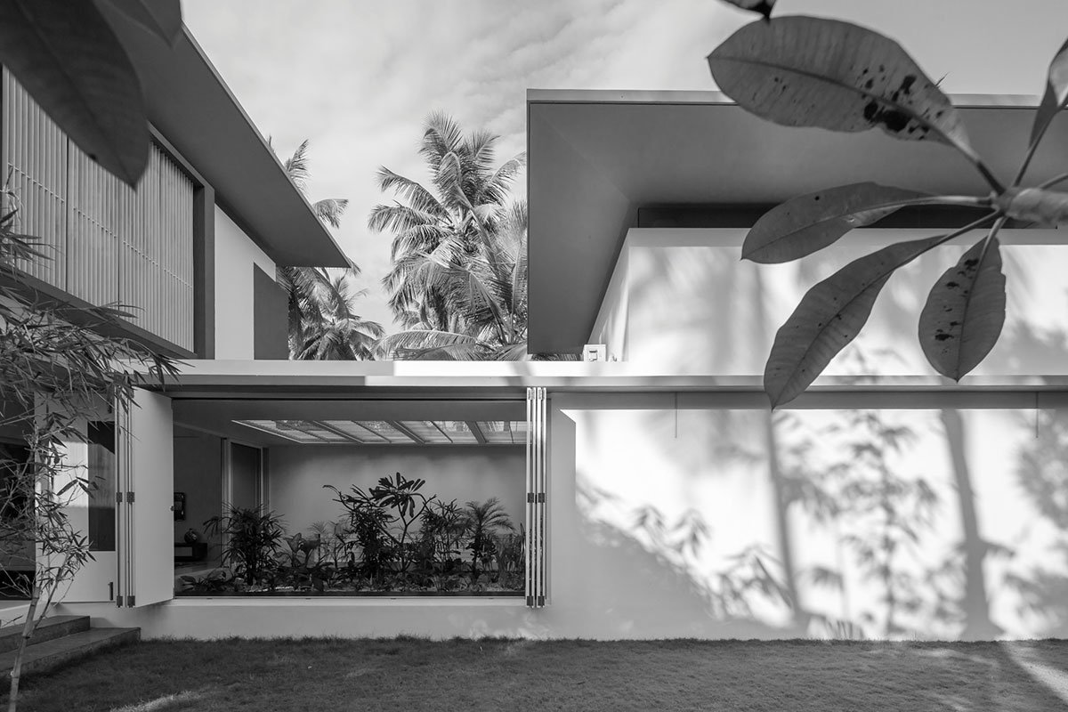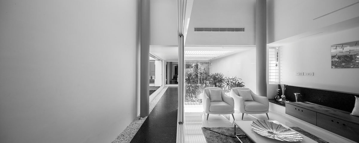 These roofs also shade the mass below from the harsh tropical sun. All spaces are naturally cross ventilated. Moreover the combination of strategically placed courtyards, skylights and volumetrically interconnected spaces, help keep the internal temperature at a minimum, without resorting to any artificial ventilation, making the house comfortable throughout the year.