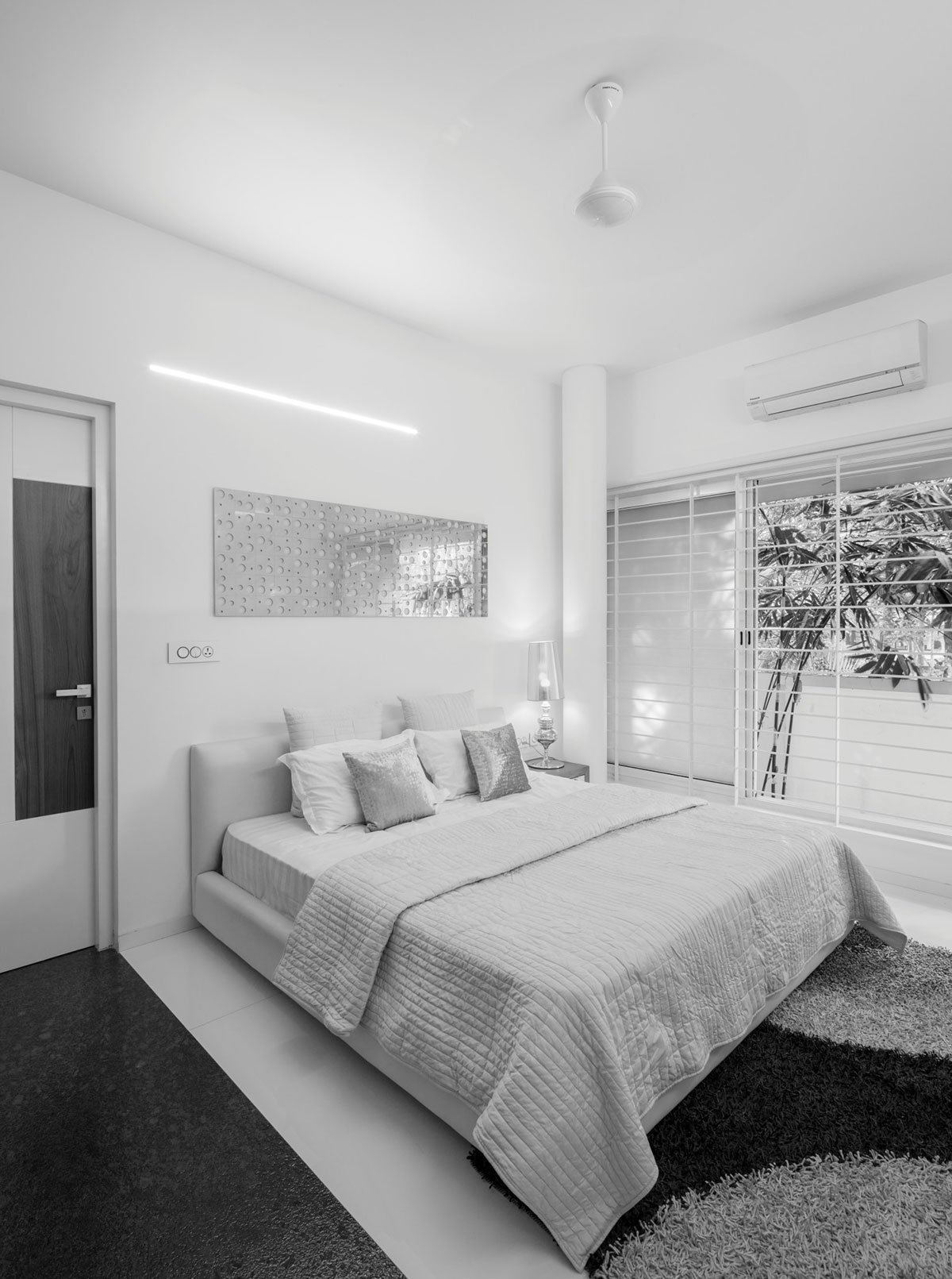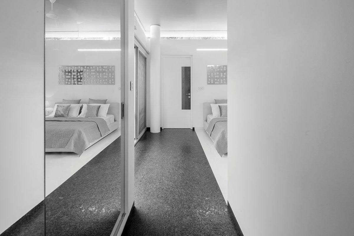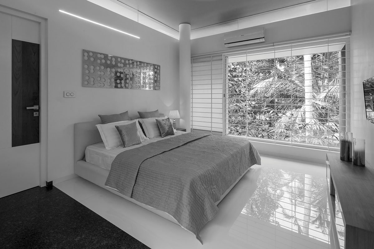Teak wood, nano white slabs, lapato/ flamed steel grey granite, mirrors and glass constitute the main material palette used in the interiors. A selection of accessories and curios in silver sheen along with custom designed wall art, in cnc cut stainless steel sheet and lacquered glass, finishes the interiors in minimalist simplicity. The large, glass and aluminium, sliding doors blur the interior-exterior divide and also help the internal spaces flow into each other.