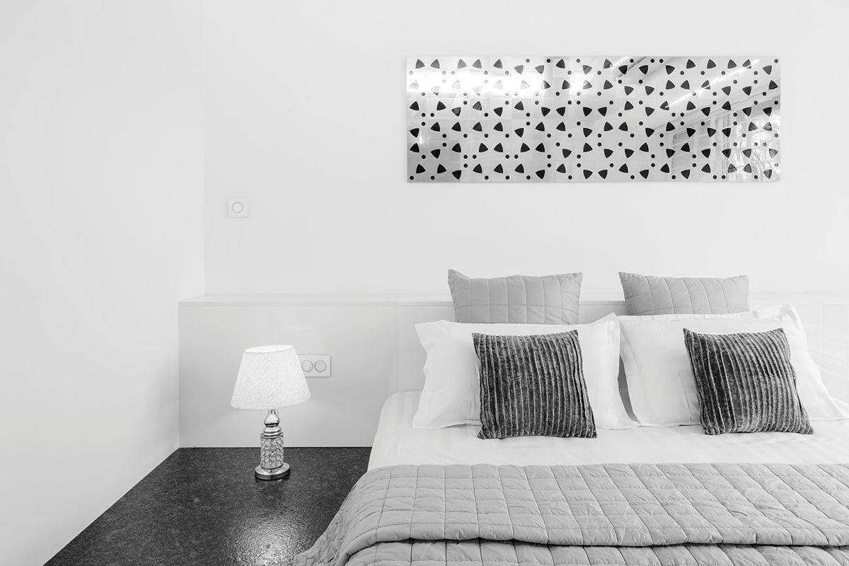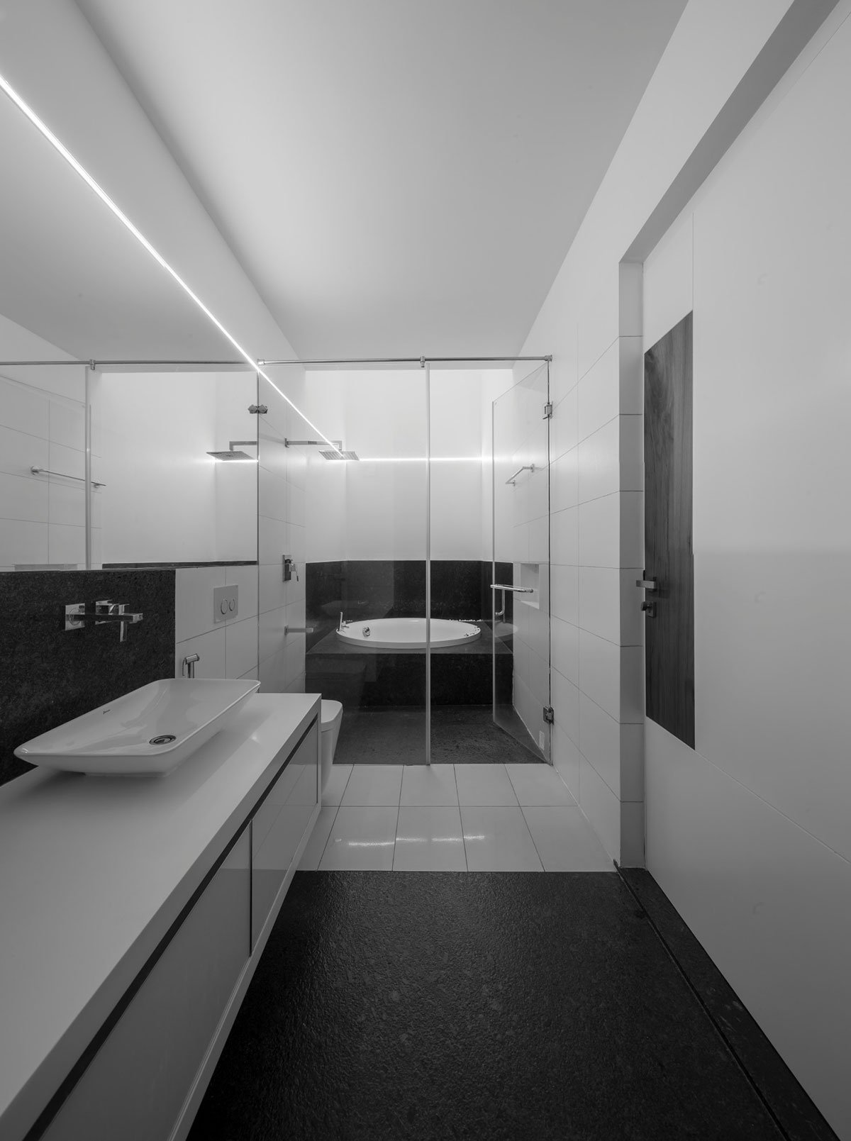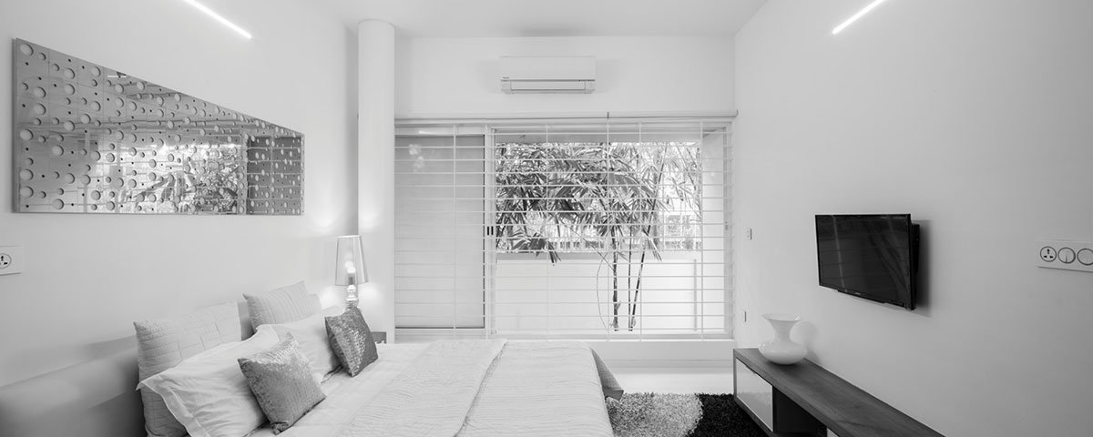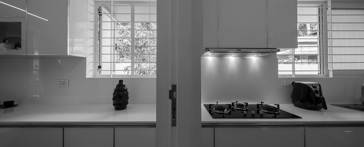 Teak wood, nano white slabs, lapato/ flamed steel grey granite, mirrors and glass constitute the main material palette used in the interiors. A selection of accessories and curios in silver sheen along with custom designed wall art, in cnc cut stainless steel sheet and lacquered glass, finishes the interiors in minimalist simplicity. The large, glass and aluminium, sliding doors blur the interior-exterior divide and also help the internal spaces flow into each other.