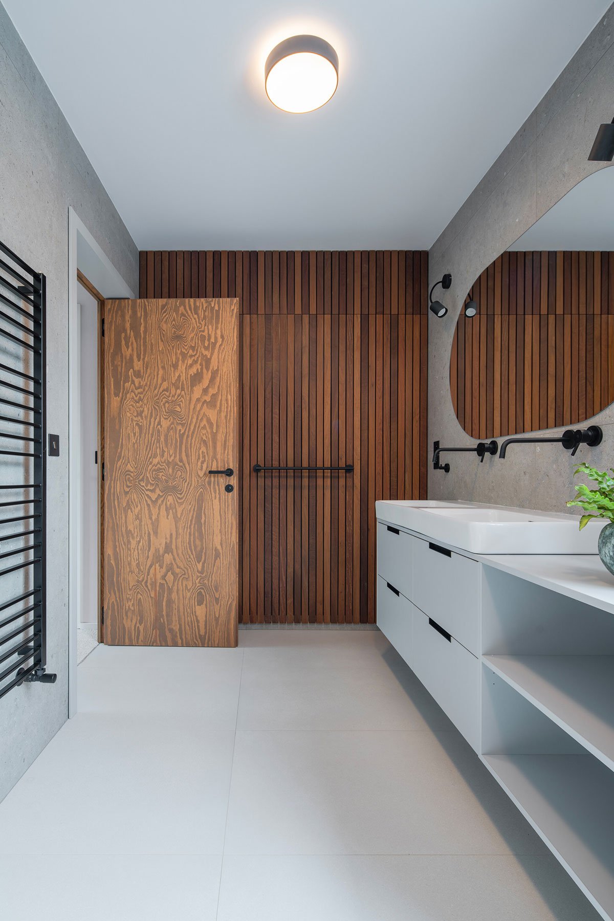 The morning rays filter through east-facing windows into the children’s rooms and the upstairs bedroom, which also includes two bathrooms and a study connected to the guest room and a small gym. Above the passage, a large terrace was created on the upper floor. A key element of the design was working with light. To bring as much light as possible into the interior, part of the roof is glazed, and the building uses large-format windows, through which light flows into the living space, guided by the offset stone wall. The common living area is connected to the kitchen and dining room, allowing the family to remain in constant contact. The ground floor also includes a technical bathroom.