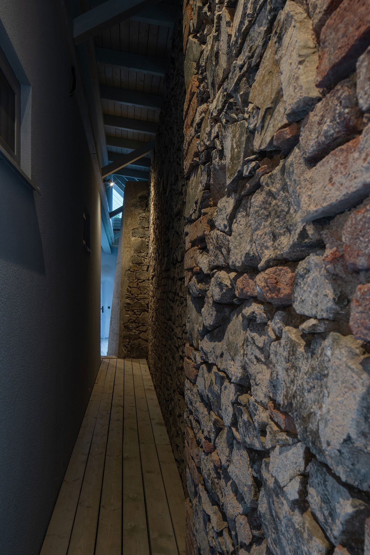 The layout was adapted to the original masonry and vaulted openings yet remained structurally completely separate. The boundary between the interior and exterior has dissolved. The new has woven itself through history, and today it’s difficult to determine where the inside begins and the outside ends. The path outside leads only through the atmosphere of the past and the traces left by previous generations.