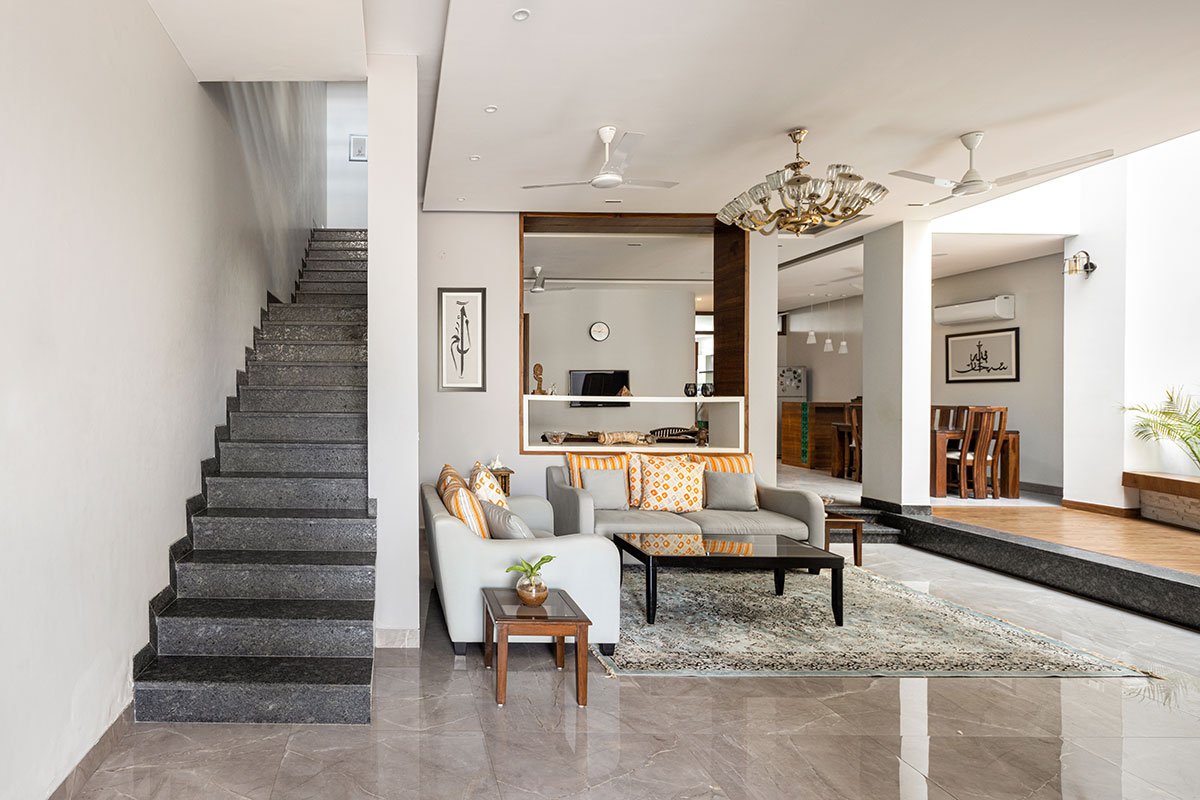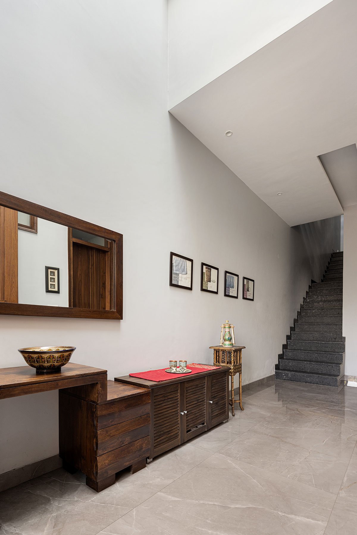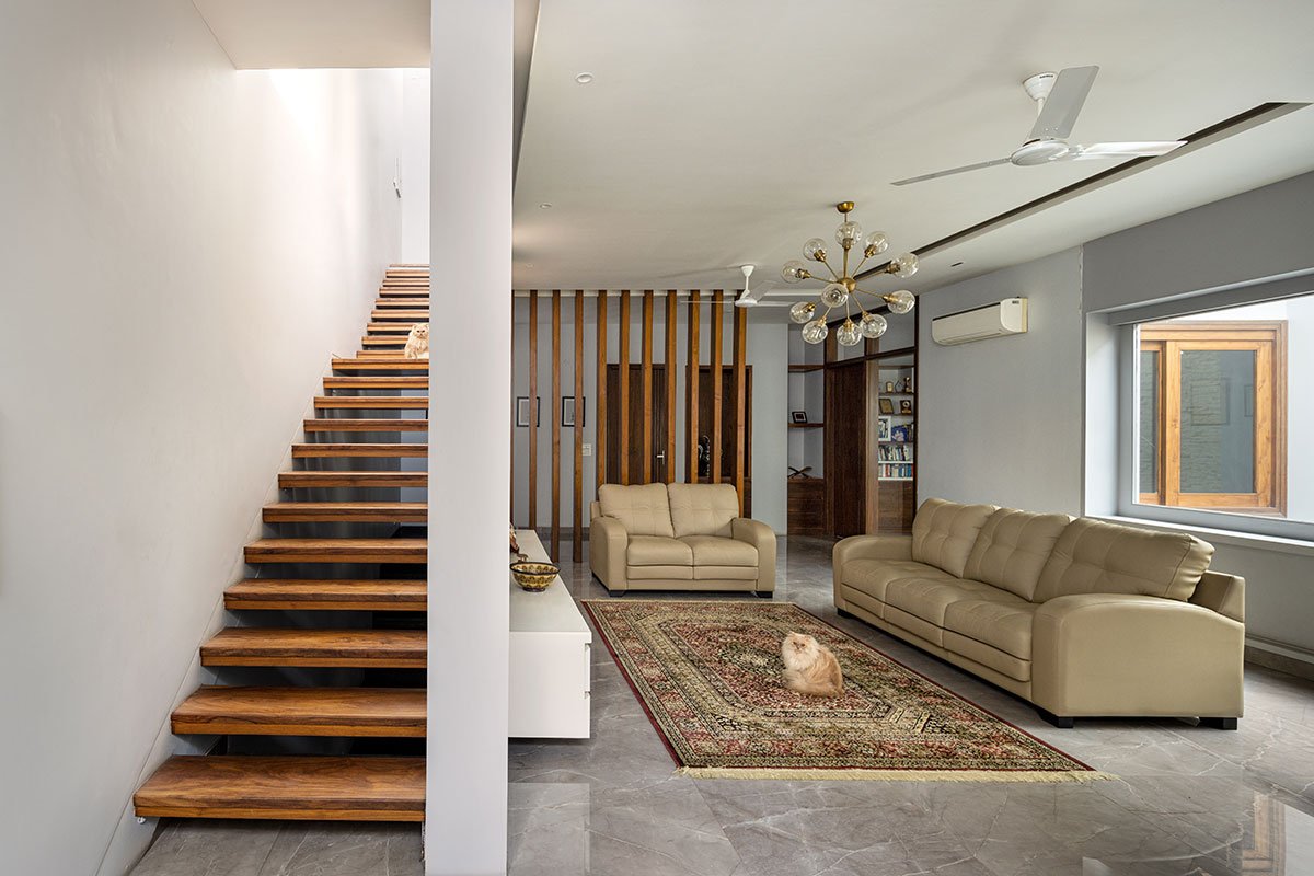 The Frames: The entire spatial arrangement is such that one discovers multiple frames within spaces, thus the name “The Framed House”. These frames separate the staircase from the family area on the first floor, formal living and lounge on the ground floor. These frames allow a notional enclosure and distant viewing at the same time.