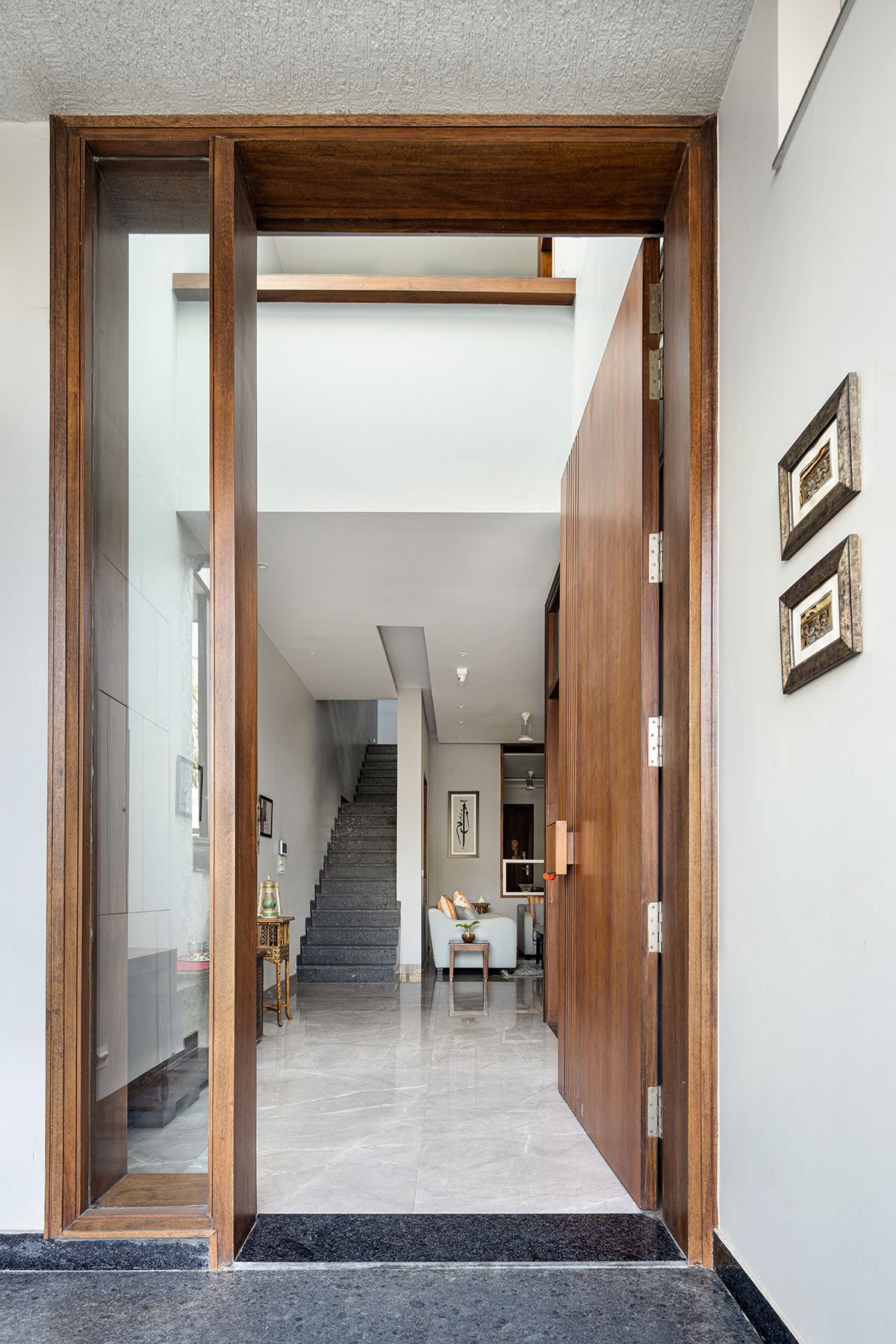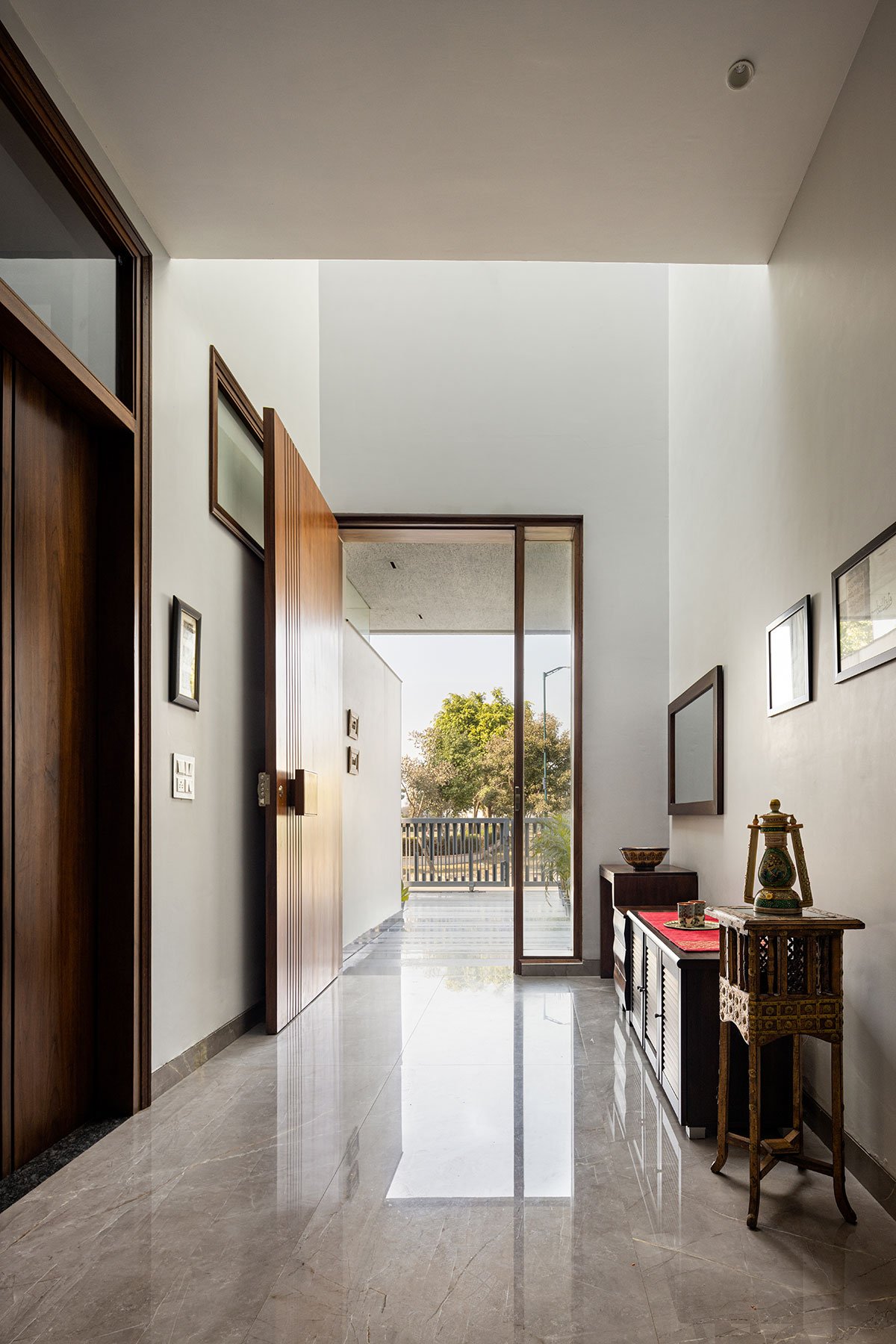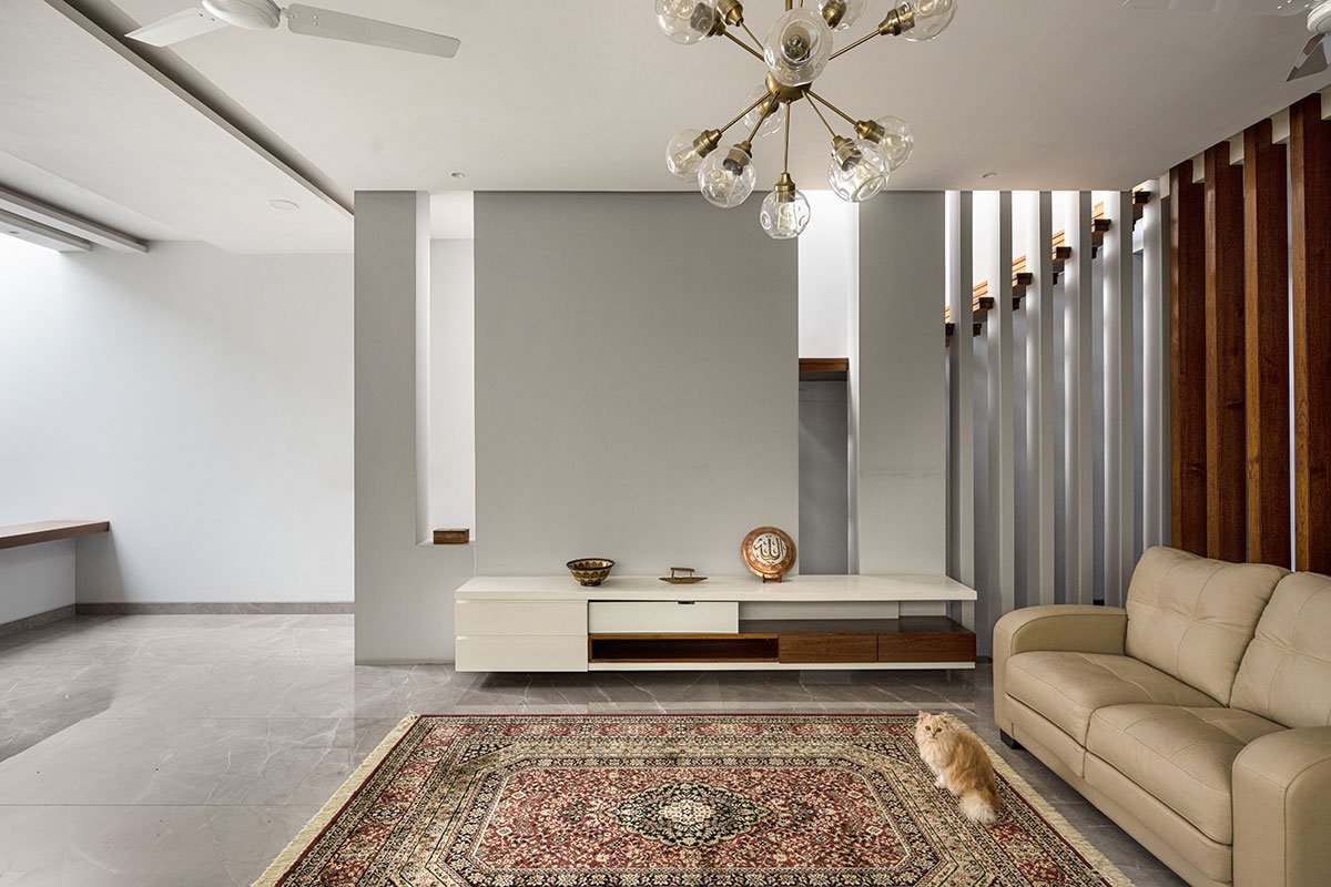 The Frames: The entire spatial arrangement is such that one discovers multiple frames within spaces, thus the name “The Framed House”. These frames separate the staircase from the family area on the first floor, formal living and lounge on the ground floor. These frames allow a notional enclosure and distant viewing at the same time.