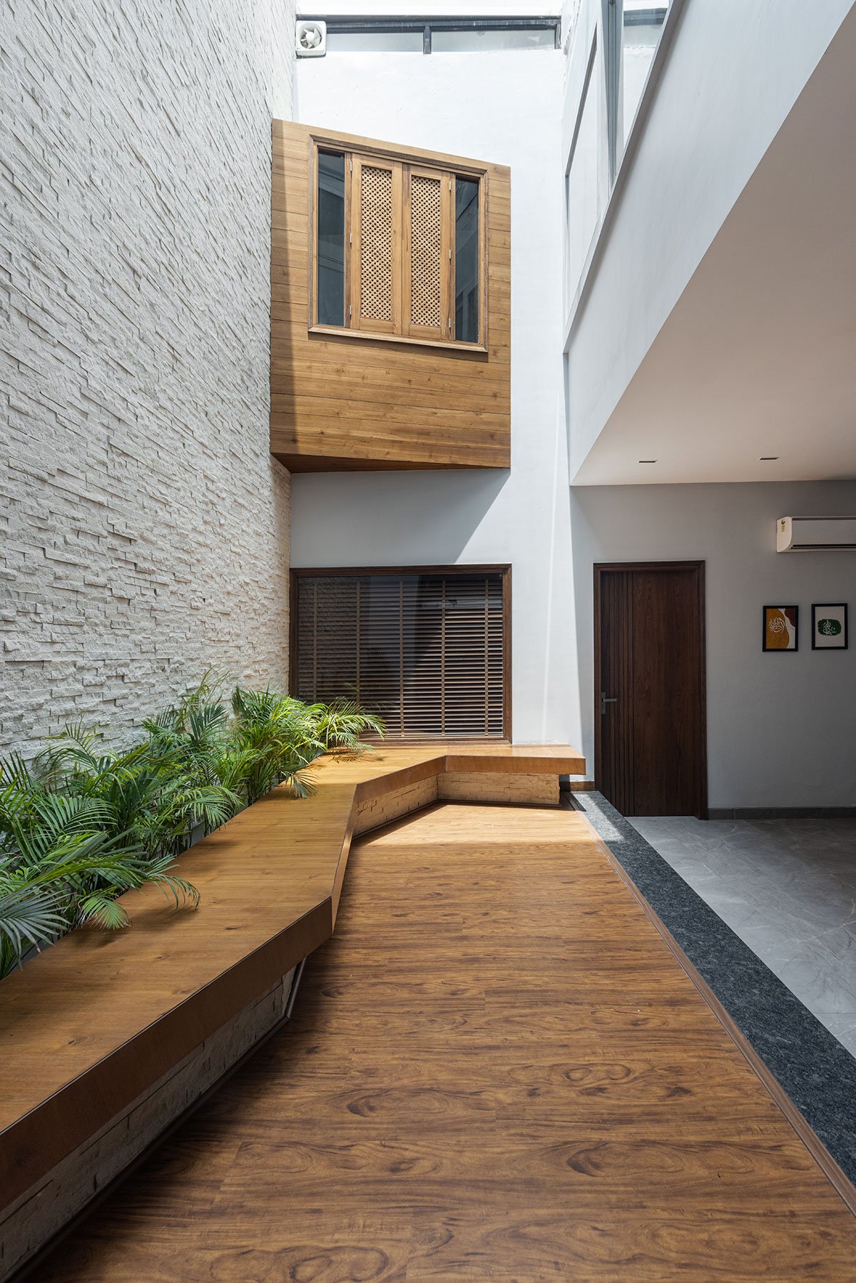 This court has all the habitable spaces like the dining, bedroom, formal living abutting around it. The formal living is part of the circulation space rather than being a locked space tucked away on one side. A framed opening between the living and small family sustains the transparency in the house. The dry court covered with glass skylight is an extension to the formal living area in order to create an informality in the space that can be enjoyed from neighboring spaces like the dining and bedroom area. The window shutters were crafted from Kashmir to bring reminisces of the roots of the owners.