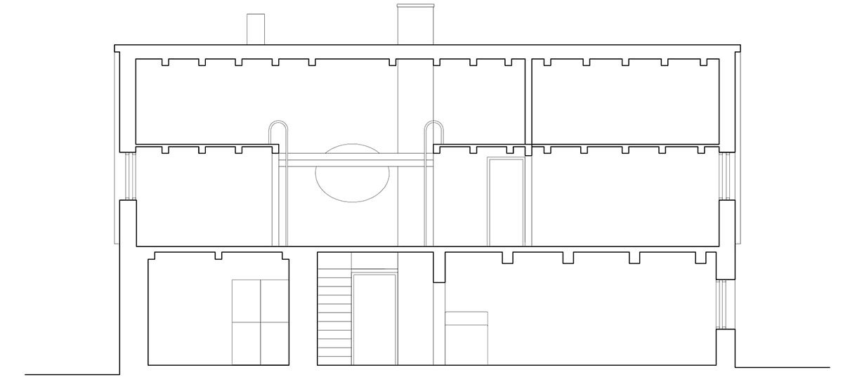 From the entrance corridor we climb to the first floor on subtle steel stairs past a round skylight that illuminates the entire space. The old beams smell of history and above is the original thatched roof, which we managed to preserve. It offers a glimpse of what the house looked like before we took over. Where the planks of the original floor could not be salvaged, there is now glass floor. The glazed elements replacing the decayed wood link the interior space into a surprising ensemble and provide unexpected views through the house. The upper floor is dedicated to slumber. Four bedrooms offer the snoozers a wide range of experiences. The glass-walled master bedroom is a charmer. At night, in the hours when the house falls silent and you’re drifting into a dream, it becomes the captain’s bridge. The round skylight shines like the moon over the sea, and the sailors in bed have the whole ocean of the interior at their fingertips.