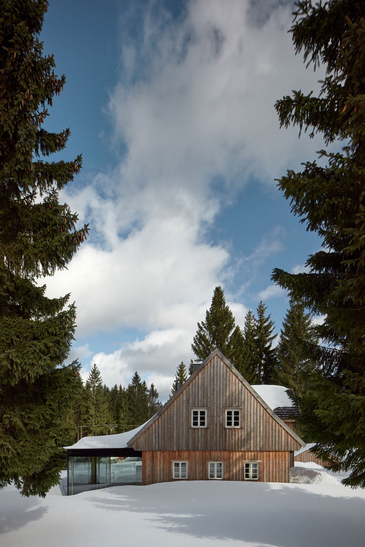 [Text as submitted by architect] In the sunshine it glistens like a marble. From the front, an inconspicuous cabin, one of the last ones before you arrive at Jizerka. But the other side of the building reveals that something extraordinary has transpired here. Behind the curtain of the original cabin, a glittering glass extension has sprung up and the house is ripe for the next act of its play.