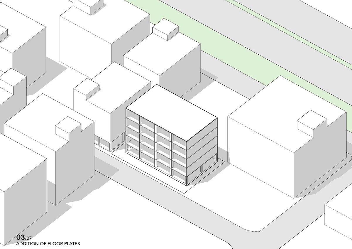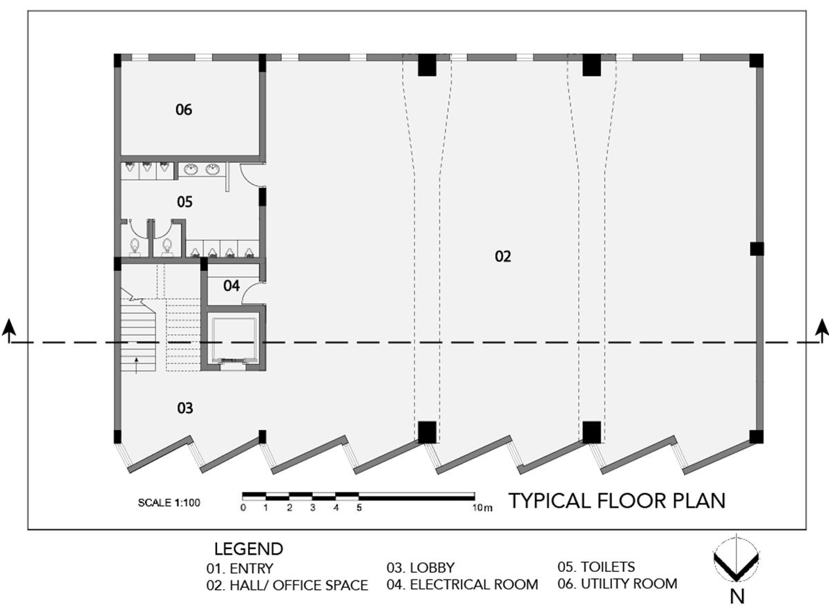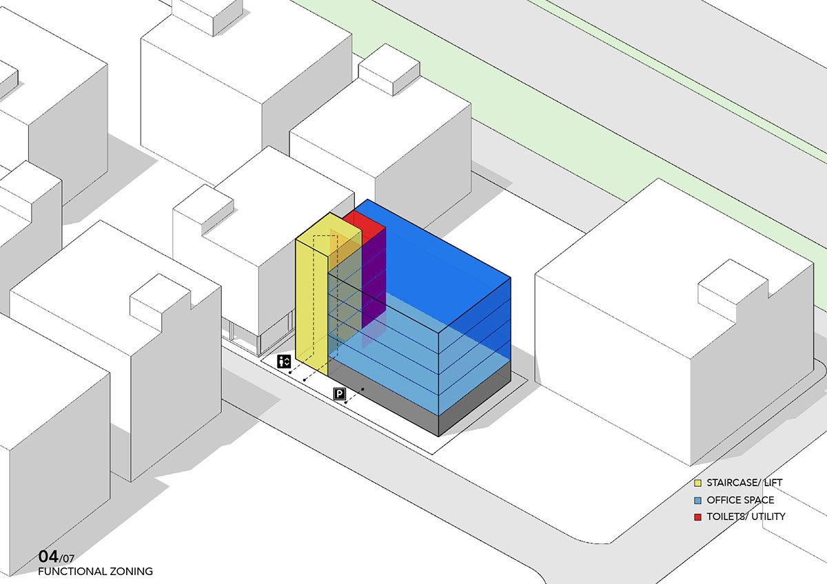 The building byelaws allowed the designers to build up to four floors. The design is a response to the question – how we rethink modern workspaces. The brief is to design office spaces that can be flexible to accommodate different clientele over changing periods of time. The idea is to optimize, integrate and segregate cores at pivotal nodes and allow interaction between spaces to maximize building flows and functions. Space for parking is provided at the Ground level. The primary vantage point for the users and vehicular traffic is the North Façade from one of the main roads in the West.