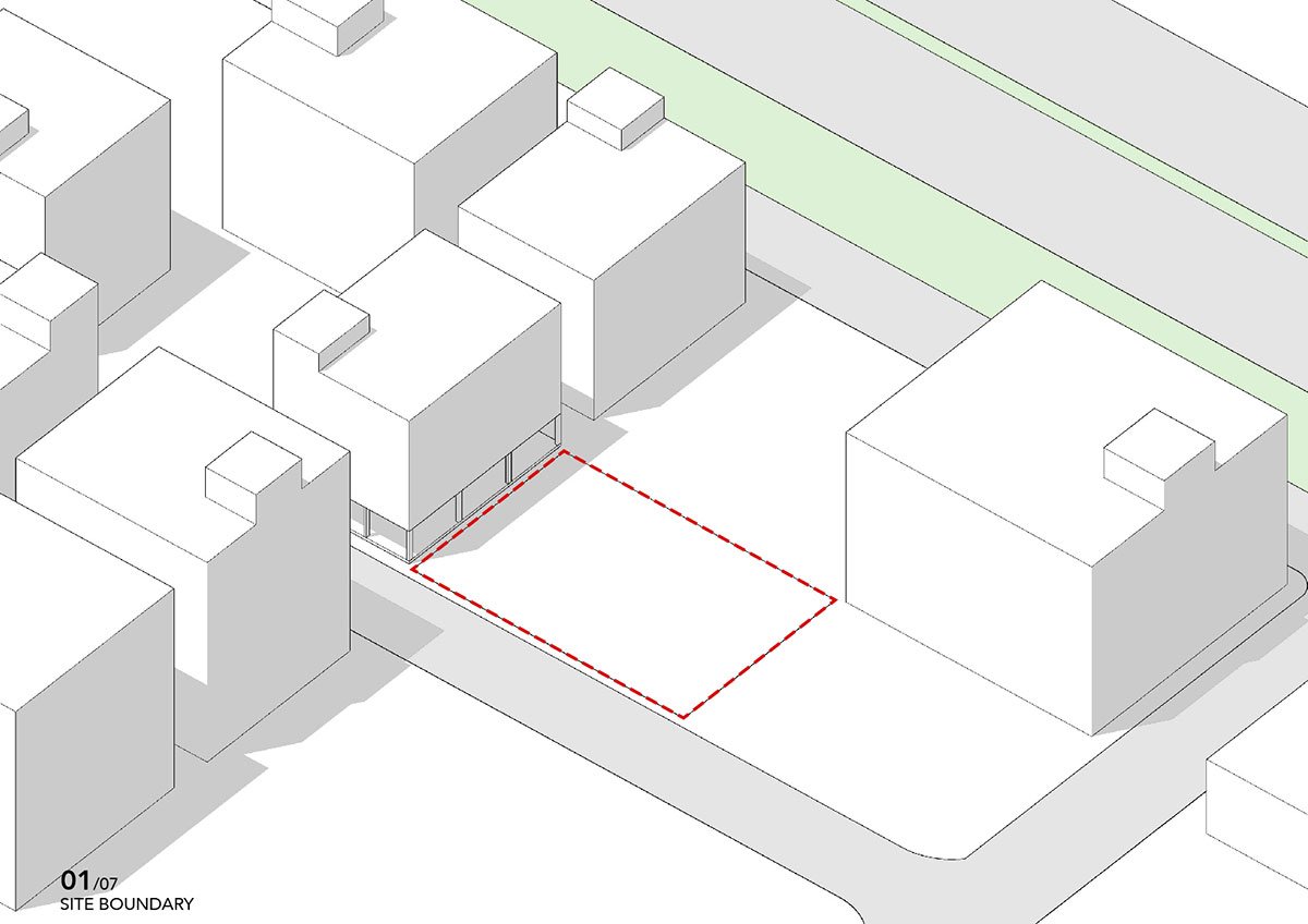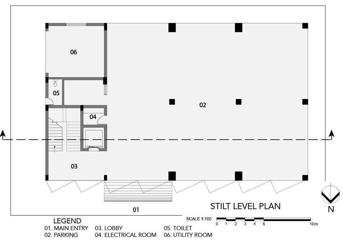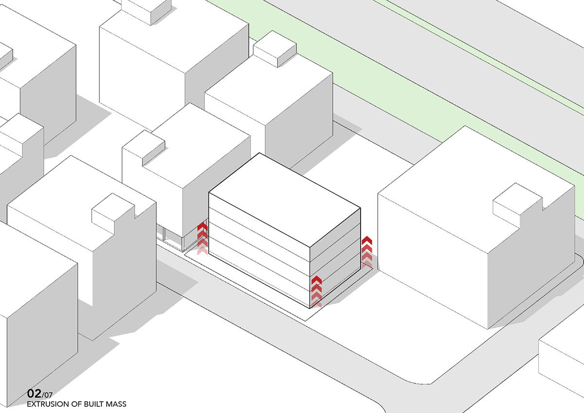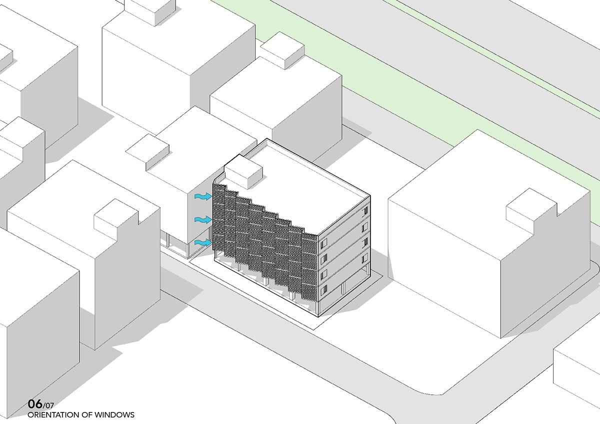 The building byelaws allowed the designers to build up to four floors. The design is a response to the question – how we rethink modern workspaces. The brief is to design office spaces that can be flexible to accommodate different clientele over changing periods of time. The idea is to optimize, integrate and segregate cores at pivotal nodes and allow interaction between spaces to maximize building flows and functions. Space for parking is provided at the Ground level. The primary vantage point for the users and vehicular traffic is the North Façade from one of the main roads in the West.