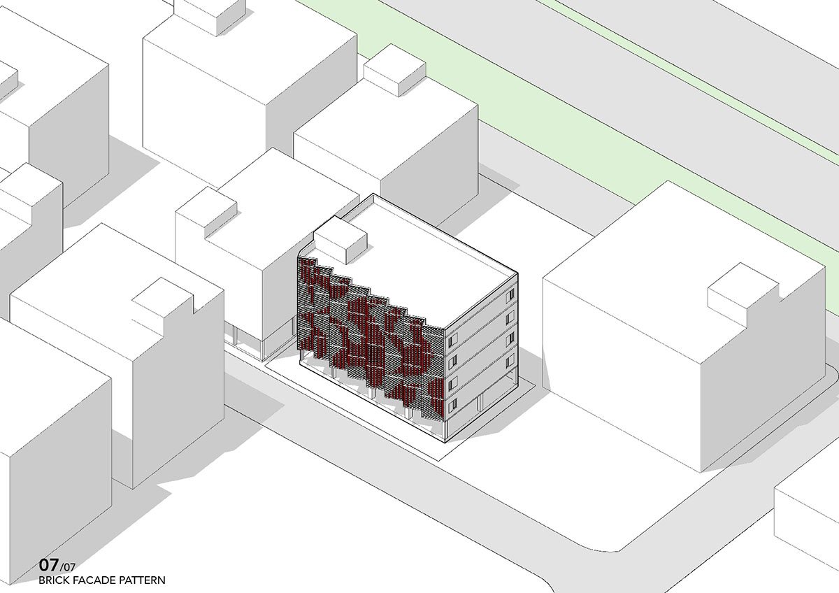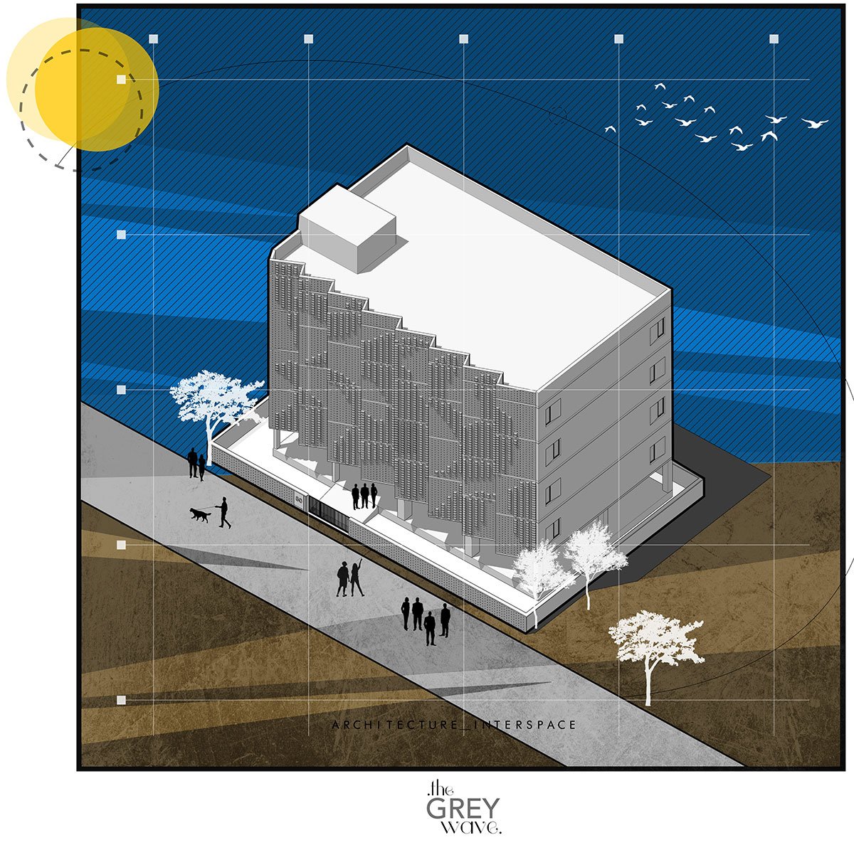 The key concept in developing the idea for the façade was to orient it to maximize the natural light entering the built space. This was done by splitting the continuous wall into bays with a splay of 30 degrees for the window position. Since the road width is 20’, the designers felt this window position would allow the maximum light during the daytime. This orientation doubled up the purpose of maximizing the view area from the West side thereby giving the designers a unique façade to work with. The primary inspiration to design the elevation was the trees abutting the front façade of the site. The idea was- ‘What if the facade swayed like a curtain like the sway of tree branches in response to the wind’. This led them into a series of explorations of digital modelling and pattern generation.