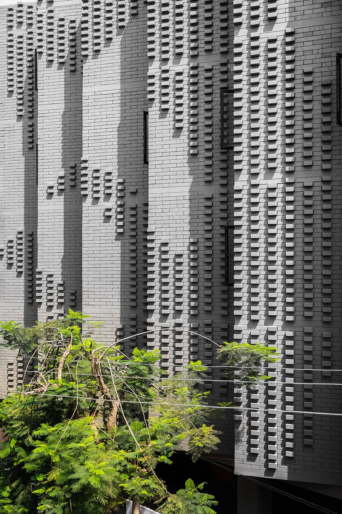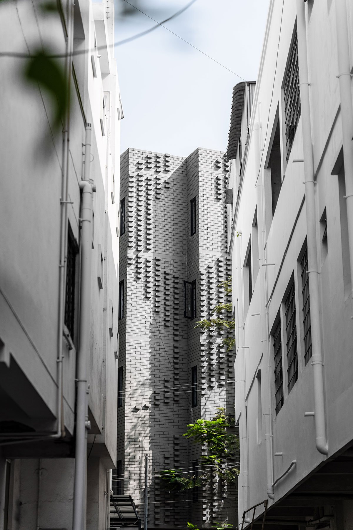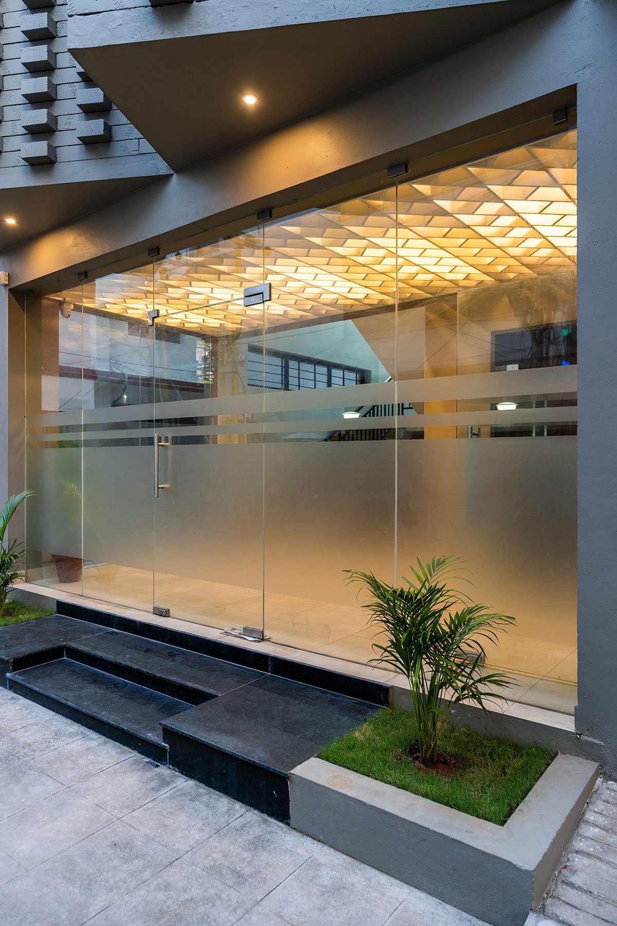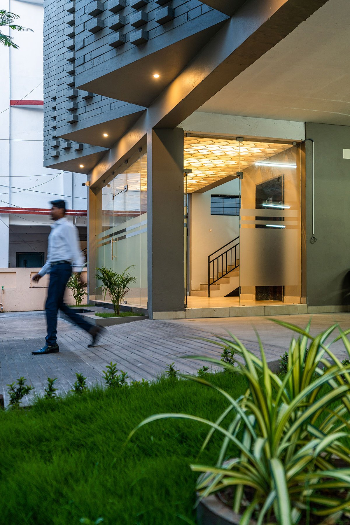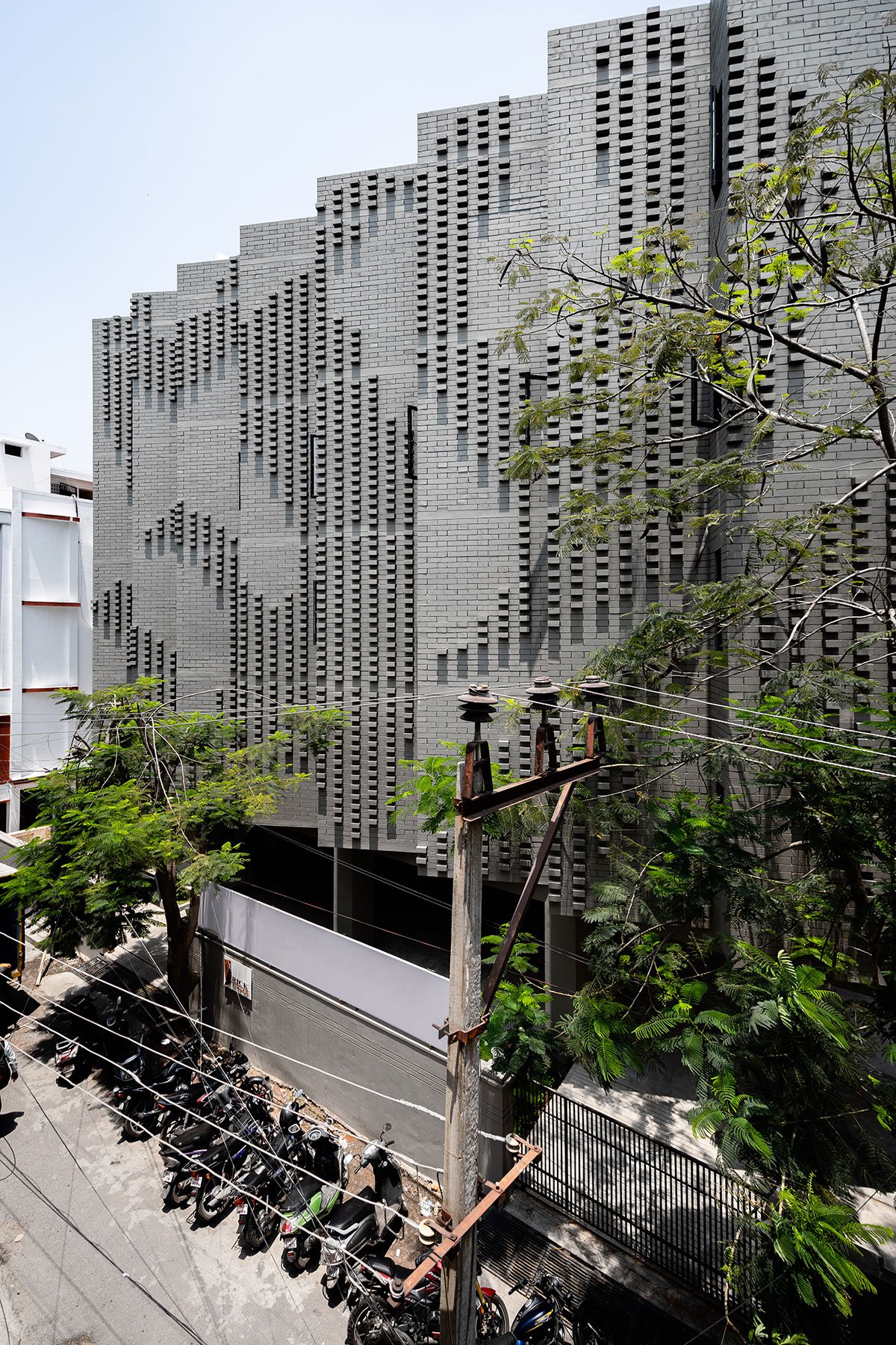 [Text as submitted by architect] The site is located at proximity to one of the primary interstate arterial roads in Pondicherry. It is surrounded by multiple retail and office buildings on all sides. The site faces the North hence careful design considerations were to be made to allow the natural light and create a unique facade. The principal intent was to design a façade that catches the vehicular and pedestrians’ attention and thereby creating an identity for the building.