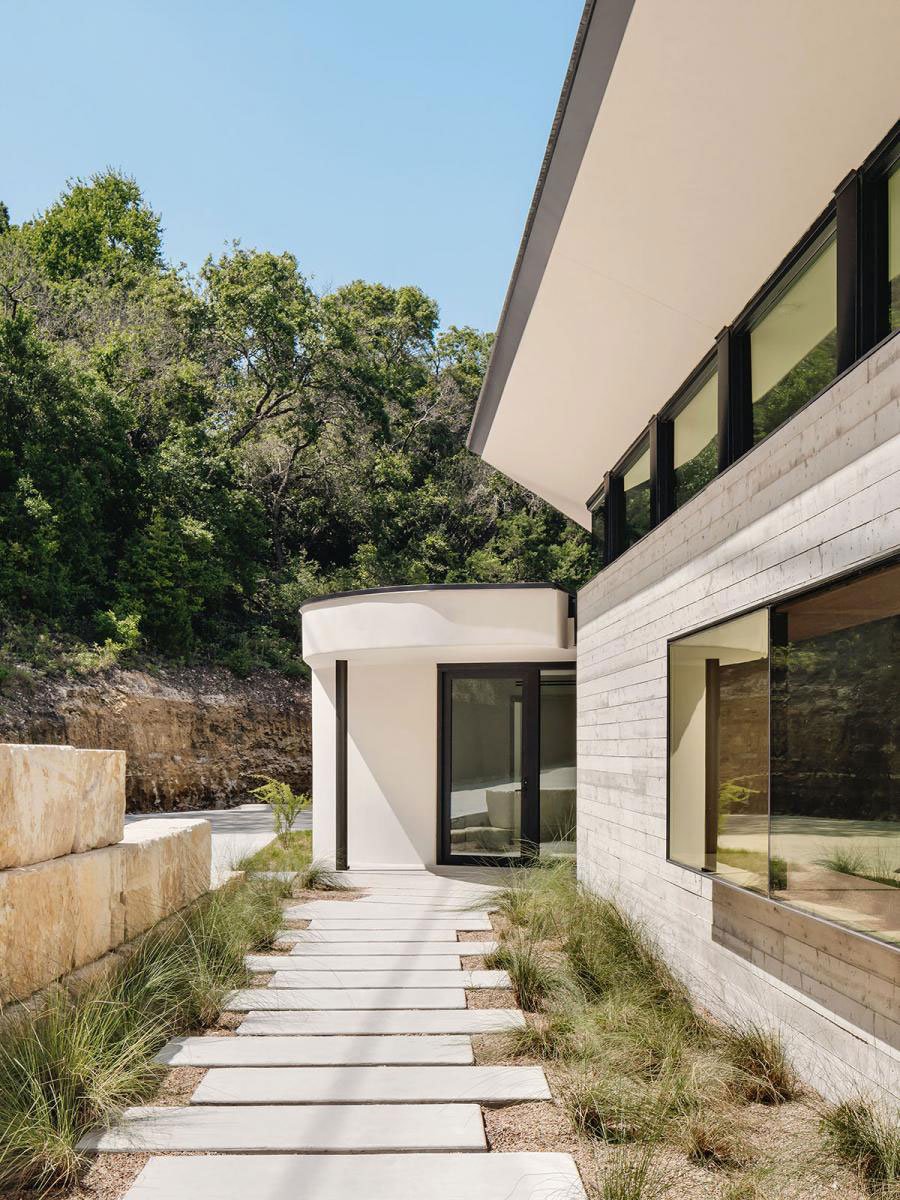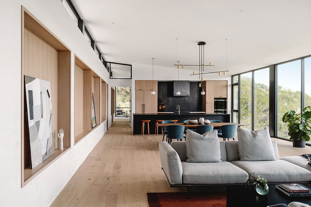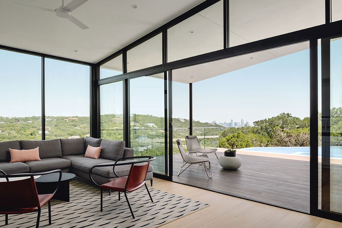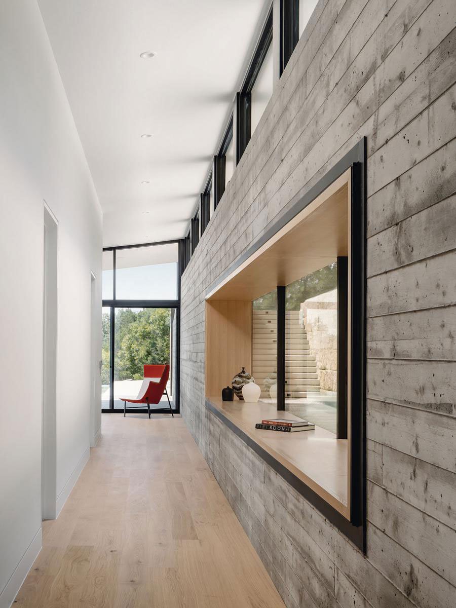 The canyon side of the home boasts floor to ceiling glass that beckons the City of Austin beyond. Canyon views are enjoyed from every room in this incomparable home.
