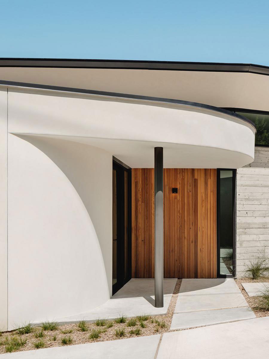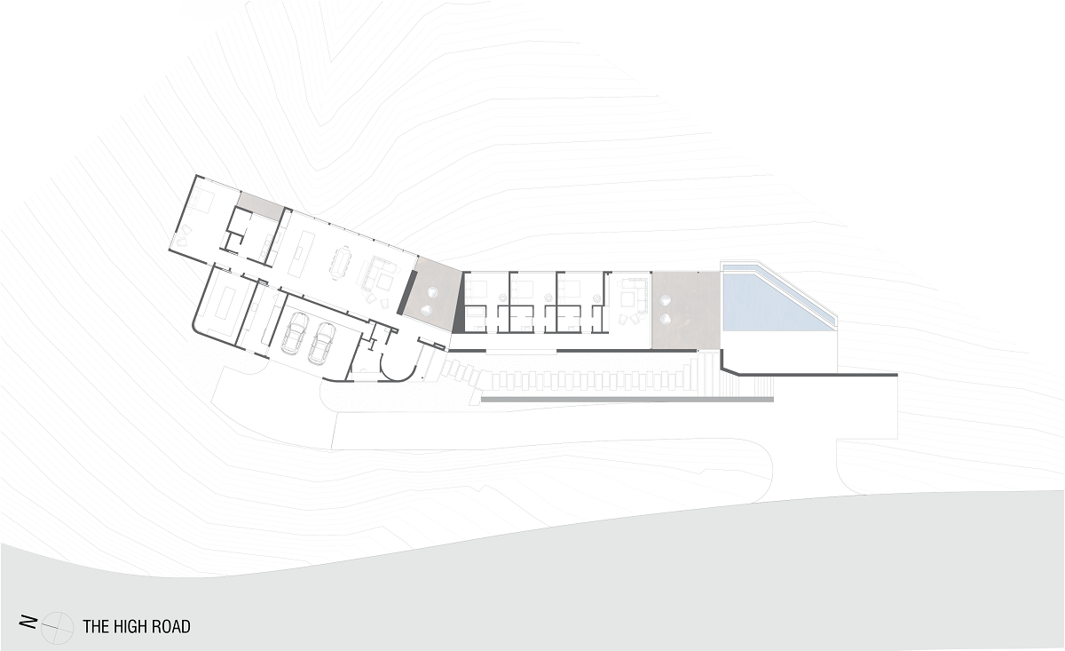 [Text as submitted by architect] The High House is configured as a boomerang to accentuate the natural curvature of the land. It perches at the brow of the hill in order to maximize the site’s 180 degree view. The street side of the home includes high walls to provide privacy while allowing plenty of light.