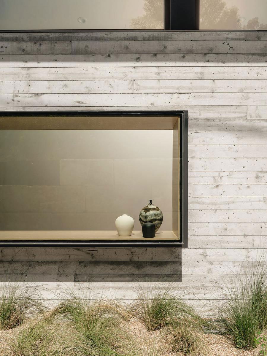 The retaining wall was made taller than necessary in order to become the main demising wall of the home. One side of the retaining wall is driveway and pedestrian access, the other side is the home, held up on piers as tall as 30 feet. Exposed Board Formed Concrete, Steel frame piers and beams, open web steel joist roof structure.