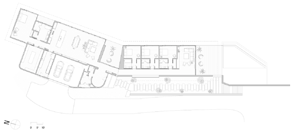 The sloping site combined with a demand for a single floor residence is an unusual combination. The site had a 20-40 degree slope. The plan was placed to take advantage of canyon and downtown views. A board formed retaining wall was placed in order to terrace the site for access.
