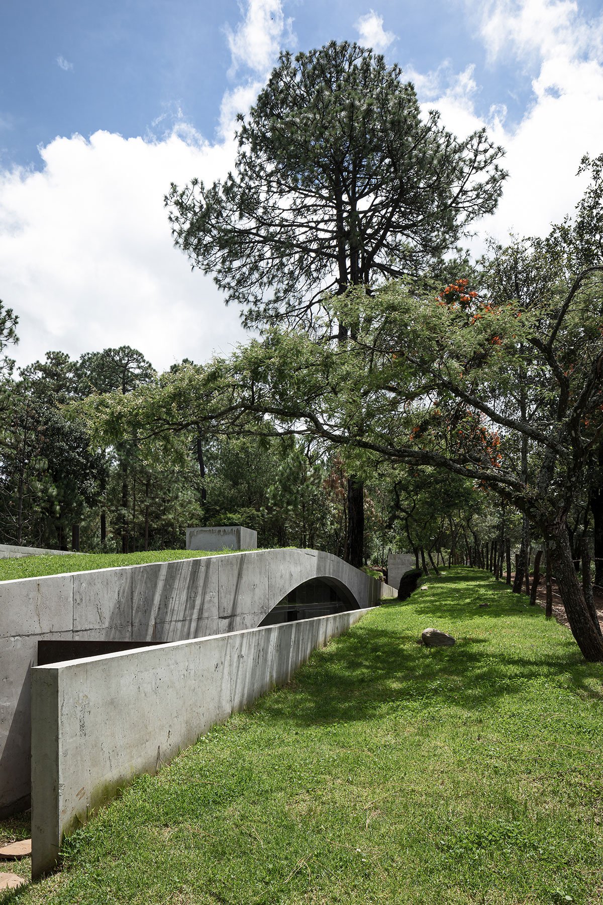 Concrete was chosen as the main material due to a dream about this new rock melting while inevitably interacting with the forest, changing colors… grays that turned to greens, blacks, and yellows that were gradually incorporated into the environment. The flooring emphasizes an aroma of wood that is perceived when surrounded by pine trees, providing balance to the cold temperature of the concrete; and finally, steel that, with time and rainfall, acquires an appearance like tree bark.
