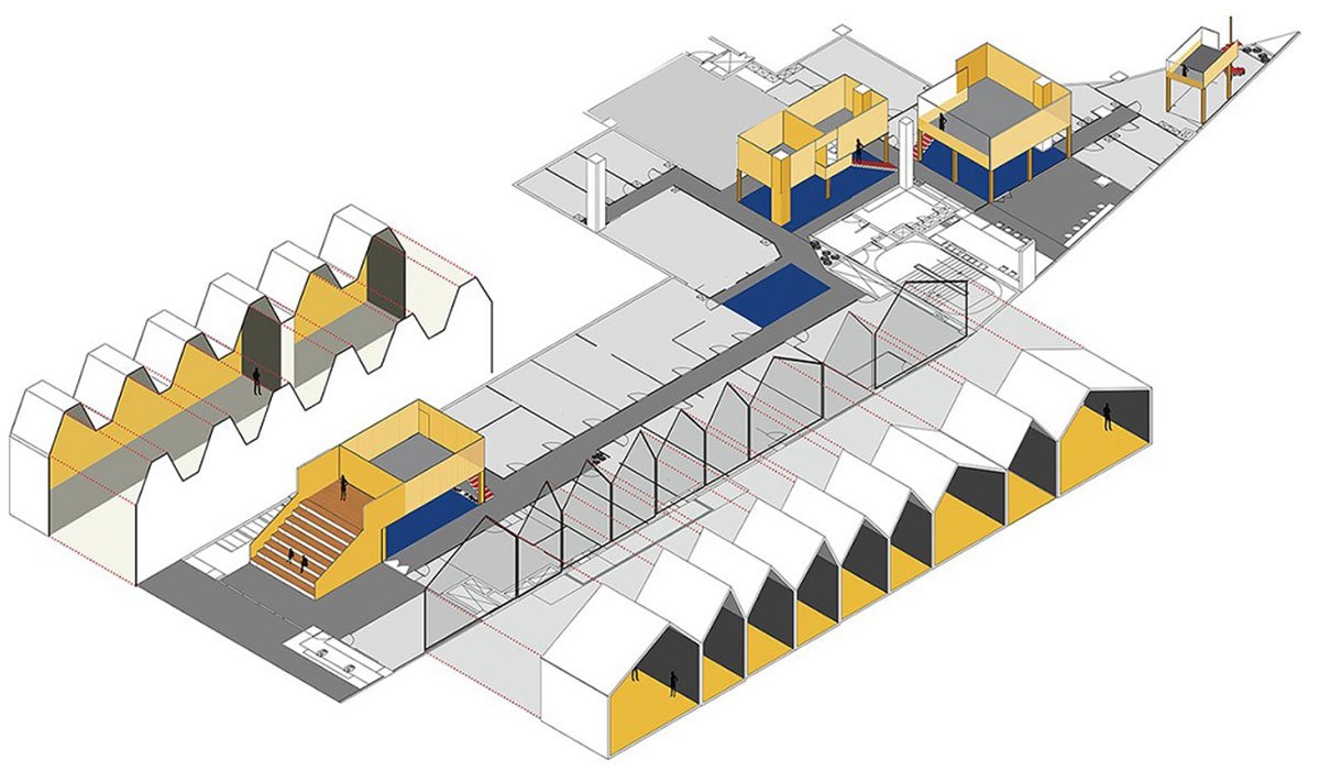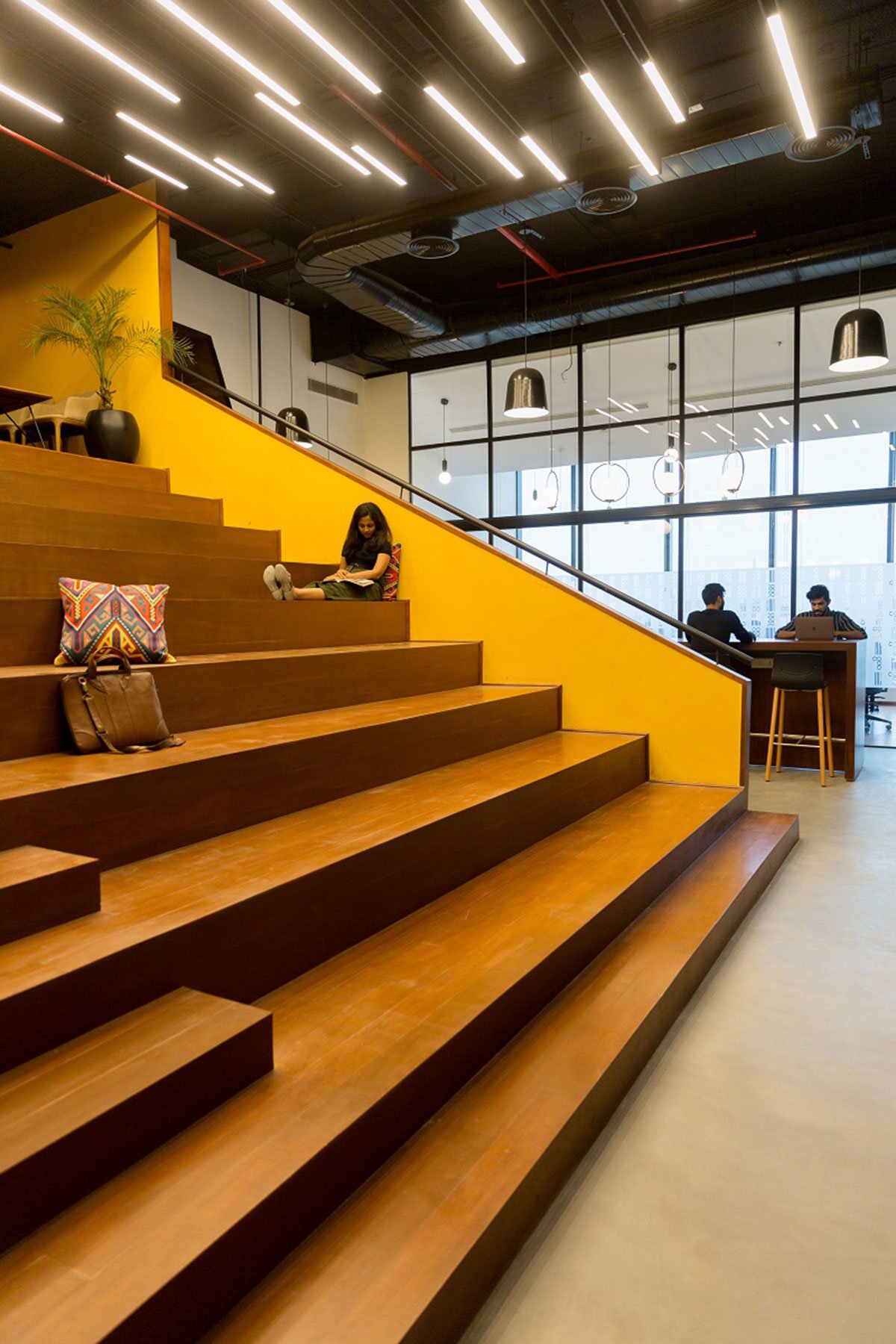 The long cement corridor blends with the Athangudi tiles which are used under each mezzanine. Wooden flooring runs through the cabins adding to the homely character of the space. The height creates an amusing play of vision through the double height effect which shows the massive scale yet the sunken areas which has a low height. The low height, cozy play area under the mezzanine leads you to the cafeteria which faces the beautiful view of newly constructed Chennai metro.