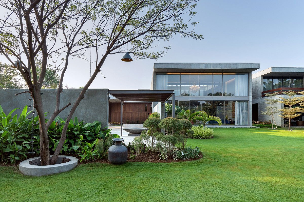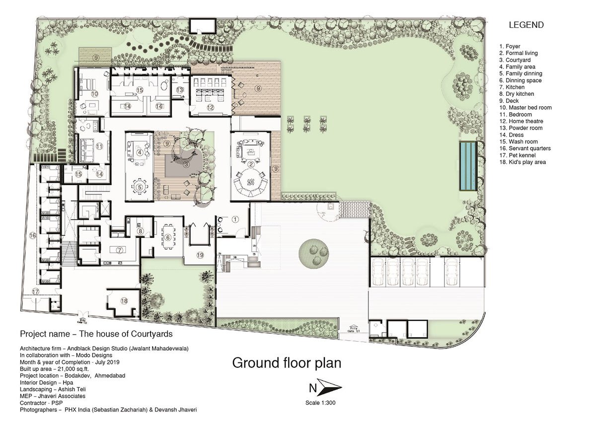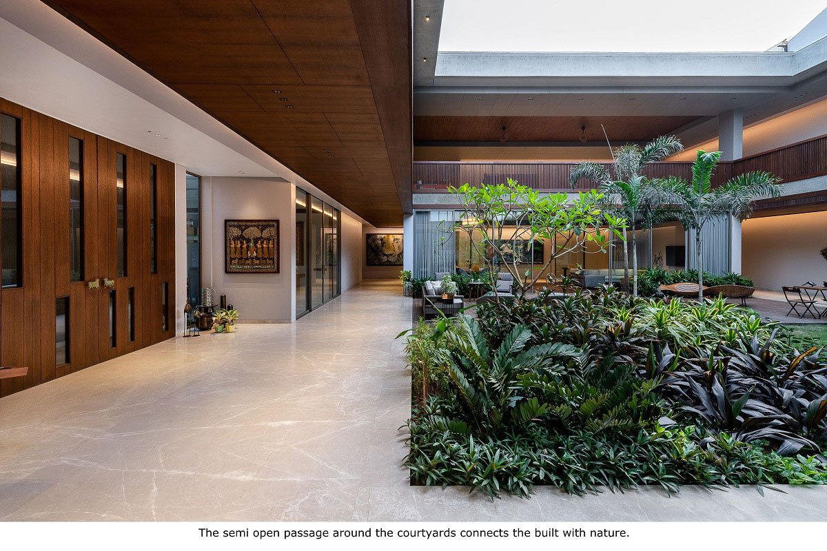 Excerpt: The House of Courtyards, designed by the architectural firm AndBlack, is a residence organized through a series of open courts. The central open courtyard reinterprets the traditional haveli houses of old city of Ahmedabad, with semi open passage around it. The unique feature is entry court and the central courtyard dense plantations that encourages use of outdoor space. The house alternates between an inward and outward oriented organization with spaces opening inward into the court as well as outward into the front and rear gardens.