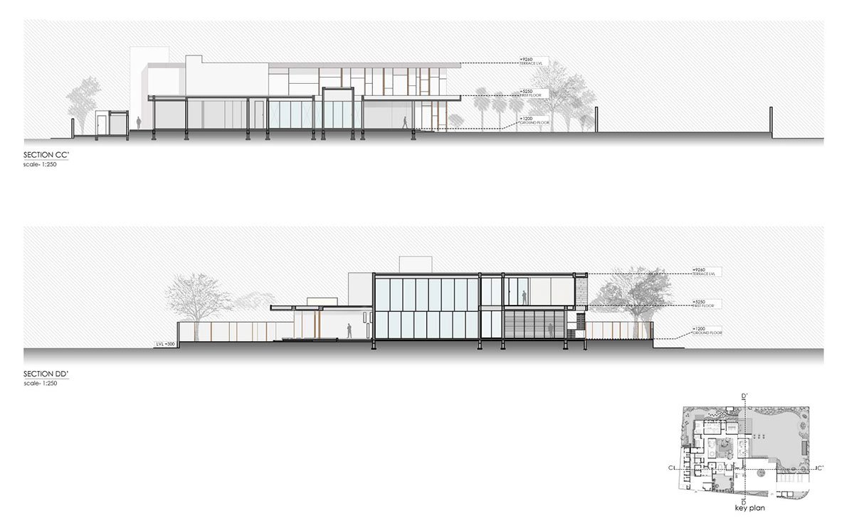The ground floor houses the entry vestibule, the formal drawing and dining rooms, informal living and dining areas, master bedroom and daughters room and home theatre. The upper level is entirely son’s unit with his lounge, bedroom and kids rooms.The unique feature is entry court and the central courtyard dense plantations that encourages use of outdoor space. The house alternates between an inward and outward oriented organization with spaces opening inward into the court as well as outward into the front and rear gardens.The house also is container of rich collection of artworks and furniture that has been collected over the years while few are customized for the specific area where they were to installed.