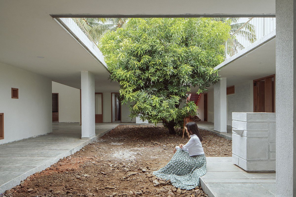 The traditional courtyard house builds upon the beauty of natural, emotional, and physical boundaries, but its essence is borrowed from the courtyard and its tree. The whitewashed exteriors reflect the simplicity of the client’s needs—he clearly wants a house that happily accommodates the family members and the mango tree while taking care of utility as well as functionality. Here, it is hard to define who comes first—the families, the tree, or the house; everyone is a crucial part of each other’s existence.