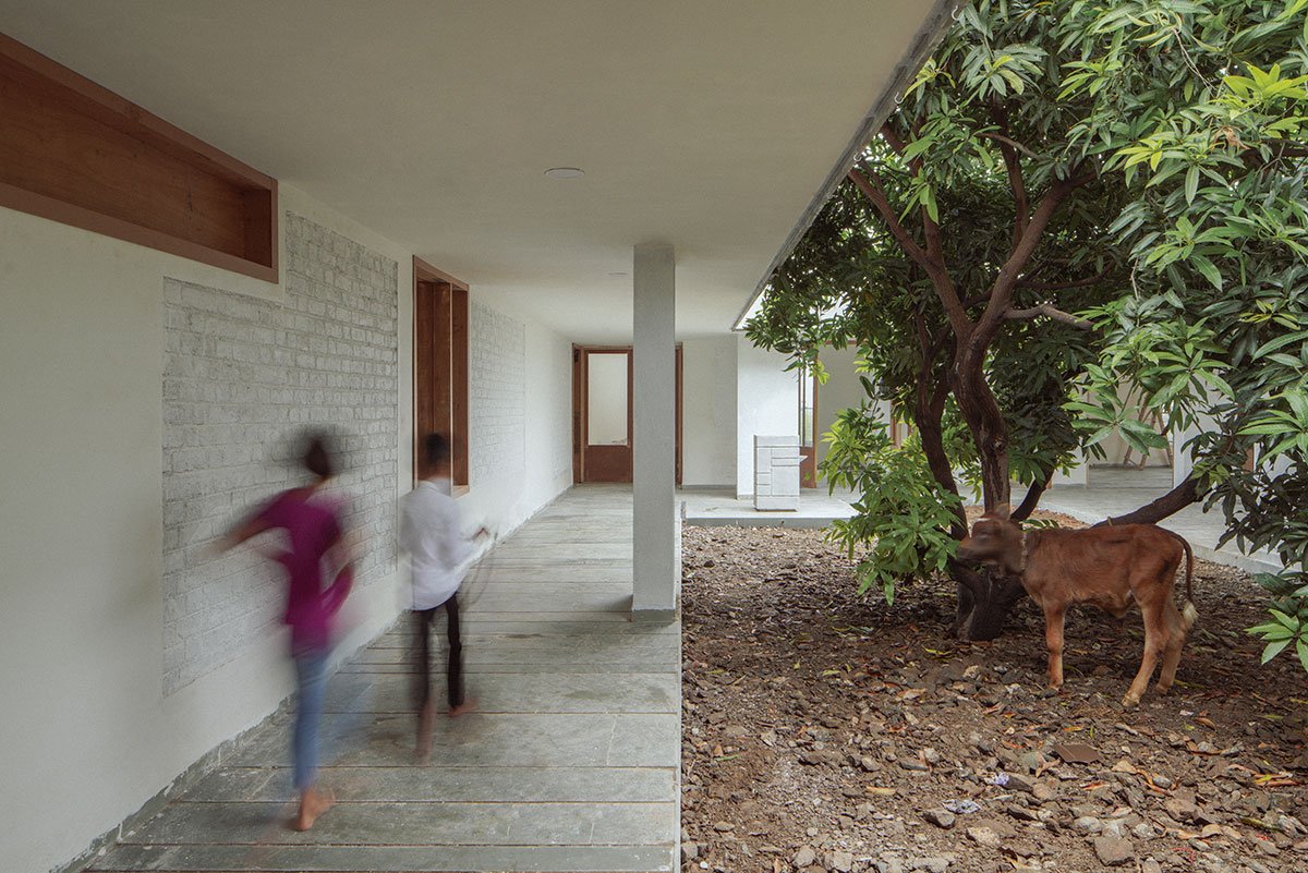 Very much like human tendencies, the house sequentially unfolds itself, from single-height spaces for each family’s use to double-height spaces for accommodating the two families together as they have their meals in the dining room or discuss their day in the living room. The verandah welcomes fellow villagers and calves with the same warmth.