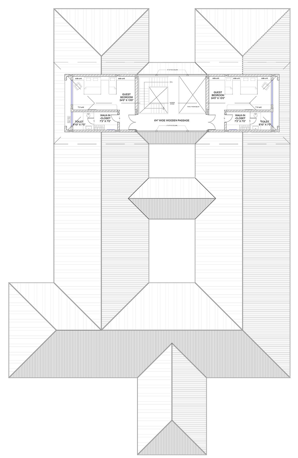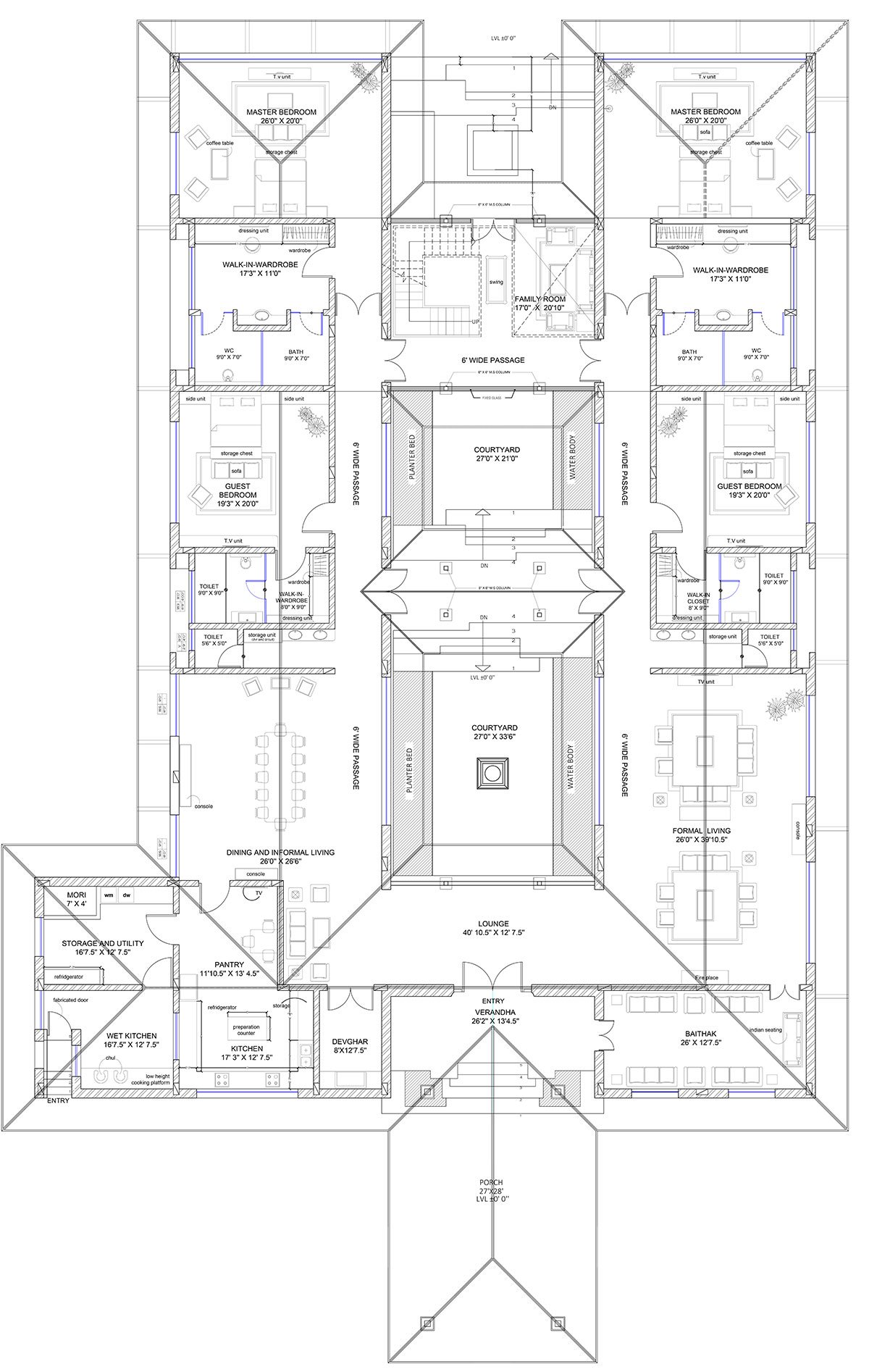 Paying homage to the earthy essence of the region, the house is a testament to vernacular design, featuring a symphony of stone and brick. Upon entering, the two inciting courtyards serve as focal points, blurring the boundaries between the indoors & outdoors. These courtyards are thoughtfully designed to reflect the rustic charm of rural living, where the living areas are bathed in natural light. The spatial planning revolves around these courtyards, offering moments of tranquility and a connection with the sky.