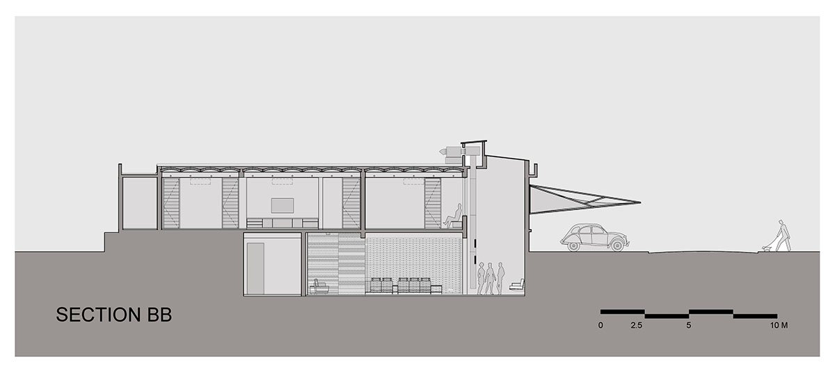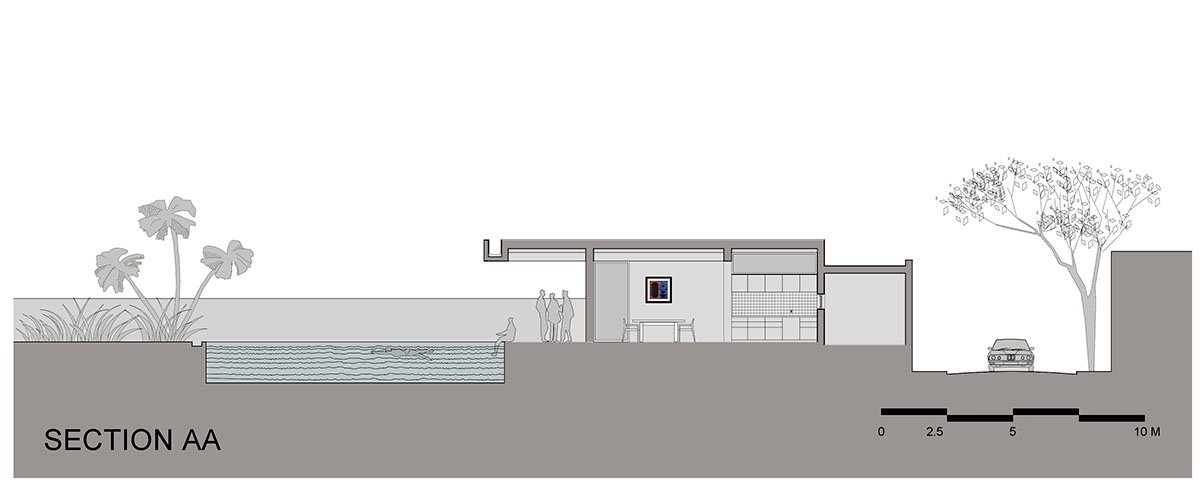 The Jack Arch House connects to the existing house and garden through its southwest-facing verandah edge. Visually, it connects and relates to the current home using its exterior simplicity- a ground floor structure with a large overhanging roof, finished in white plaster. However, the similarities between both houses end at the external level.