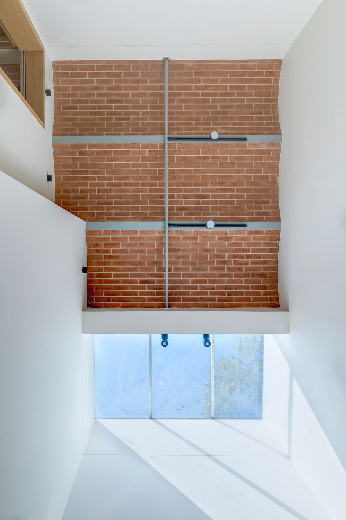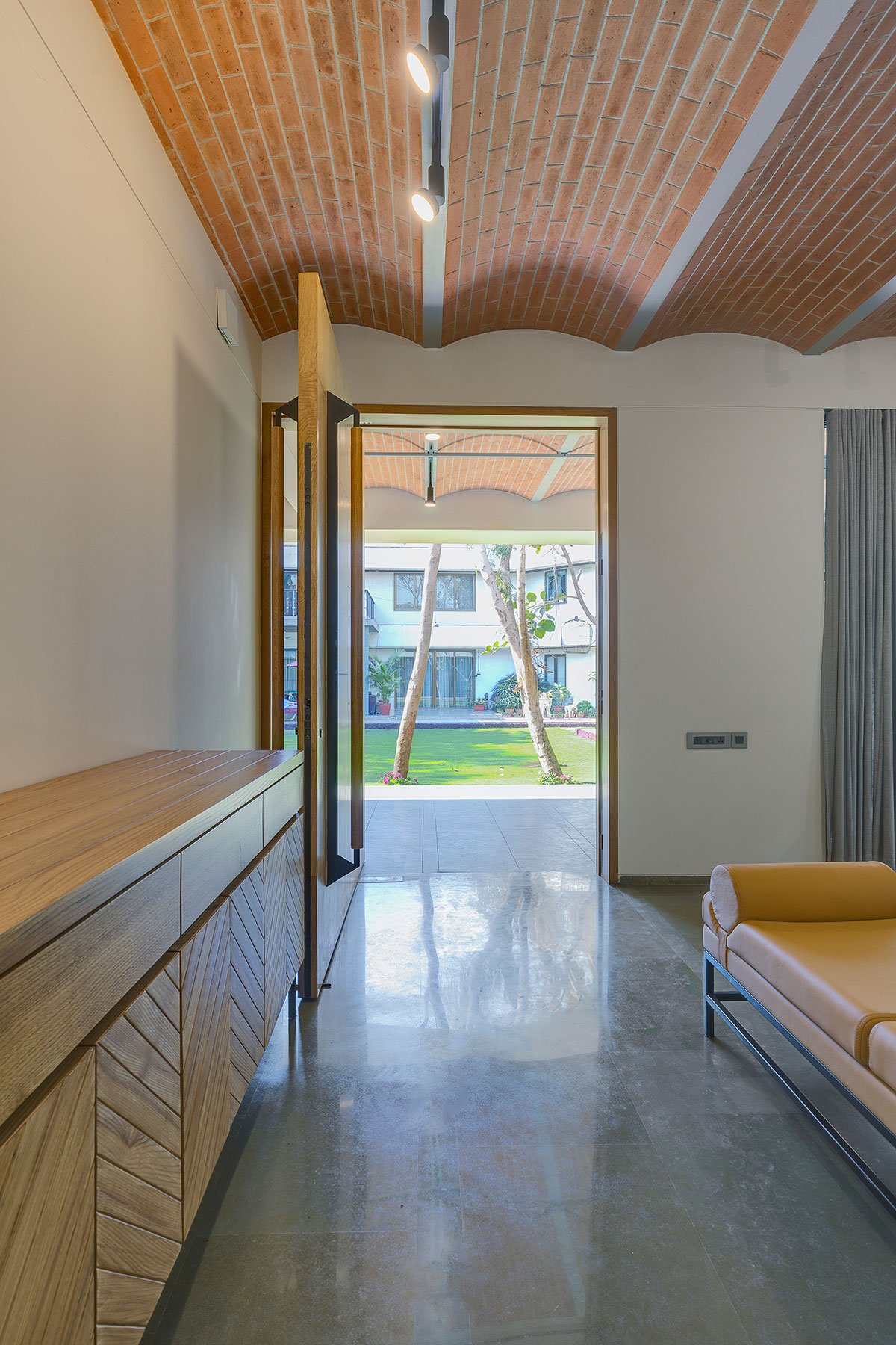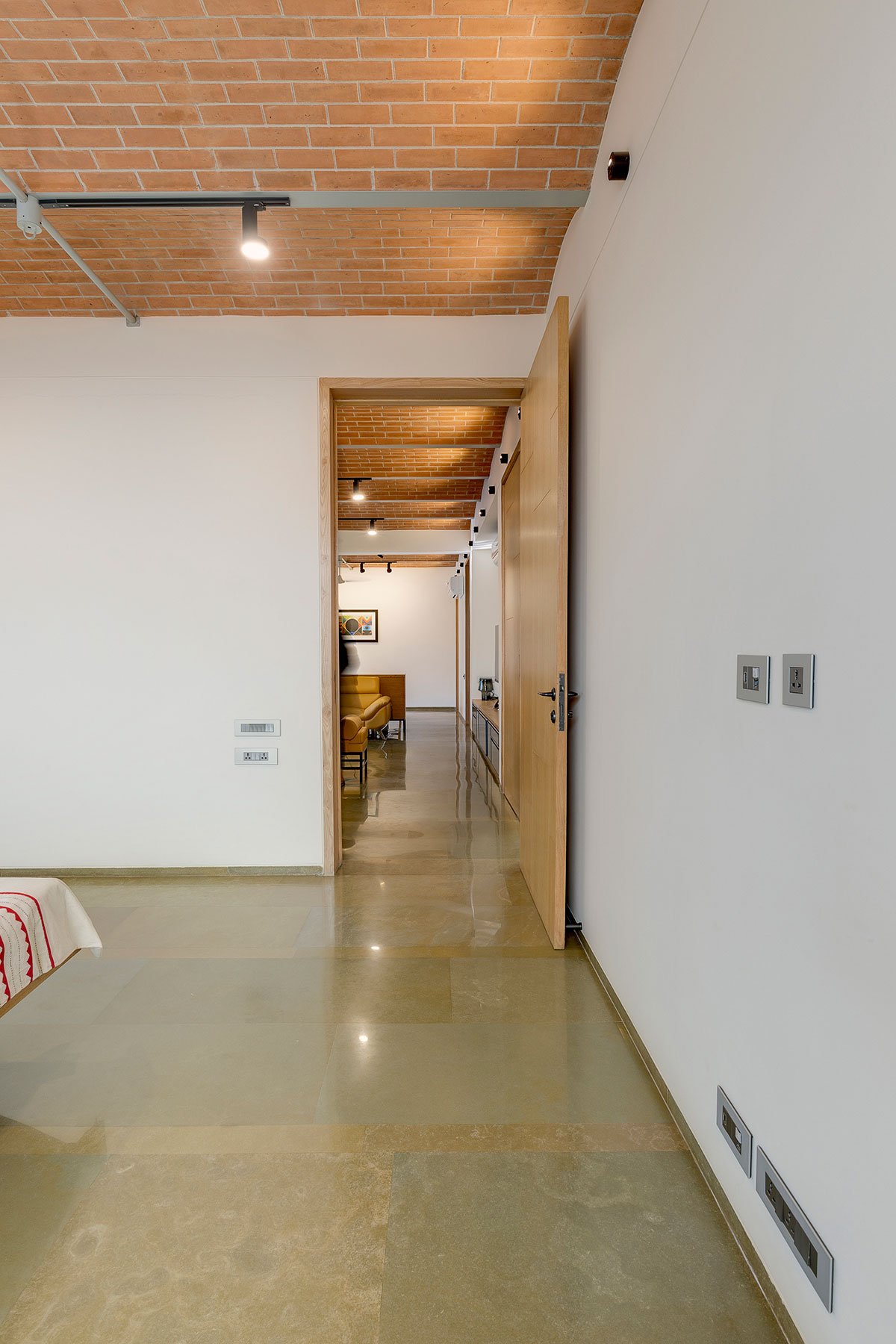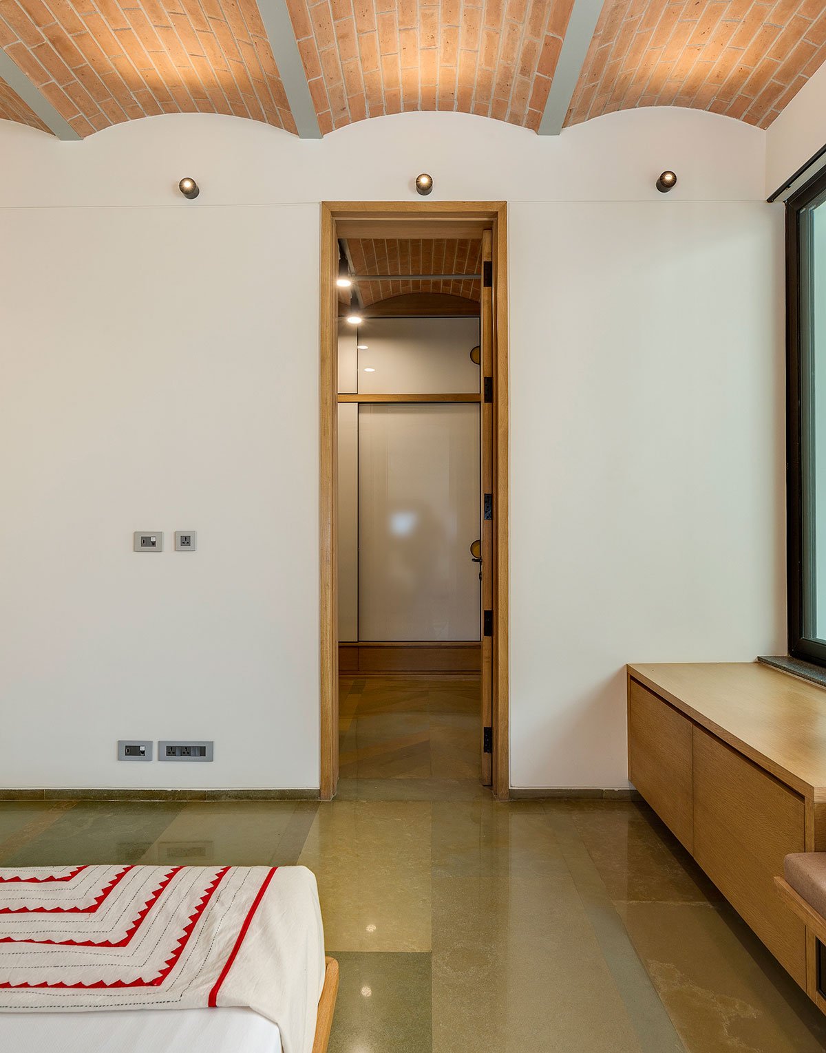 Excerpt: The Jack Arch House is a residence designed by the architectural firm PVDRS. The house is a contemporary manifestation of the traditional slab construction method. Internally, the house is characterized by exposed brick jack arches ‘hidden’ from the exterior. The house becomes a reflection of its occupants’ personality. Materially, the ground floor comprises a neutral palette of white walls, polished brown Kota flooring and light polished wood to complement the exposed brick arches.