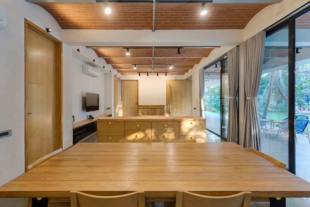 Beyond the narratives, the jack arches impart geometry, order and rhythm to the internal spaces. Whilst it emphasises the connectivity to the outside through its linearity, its geometry is carried forward in the patterns of the veneered doors, the brown Kota stone flooring and the custom-designed furniture. Experientially, the house offers a vertical connection to nature (sky and sun) through the courtyards and a horizontal relationship to the man-made landscape (pool and garden).