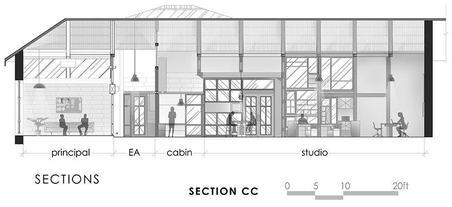 A certain sense of scale and the idea of zones within zones was explored within the facility – either through a visual connect or dedicated space configurations within a single zone. The atrium which doubles up as the entrance, allows a steady stream of light to filter in through the skylight above and houses the reception, a formal meeting room and a vertical backdrop that frames the machine room that sits atop the wooden elevator. Mirroring the functional and formal arrangements within the space, the clay tiles covering the meeting room are a true reflection of the roof above, while the machinery is a metaphorical reflection of the studio space – the powerhouse of the firm.