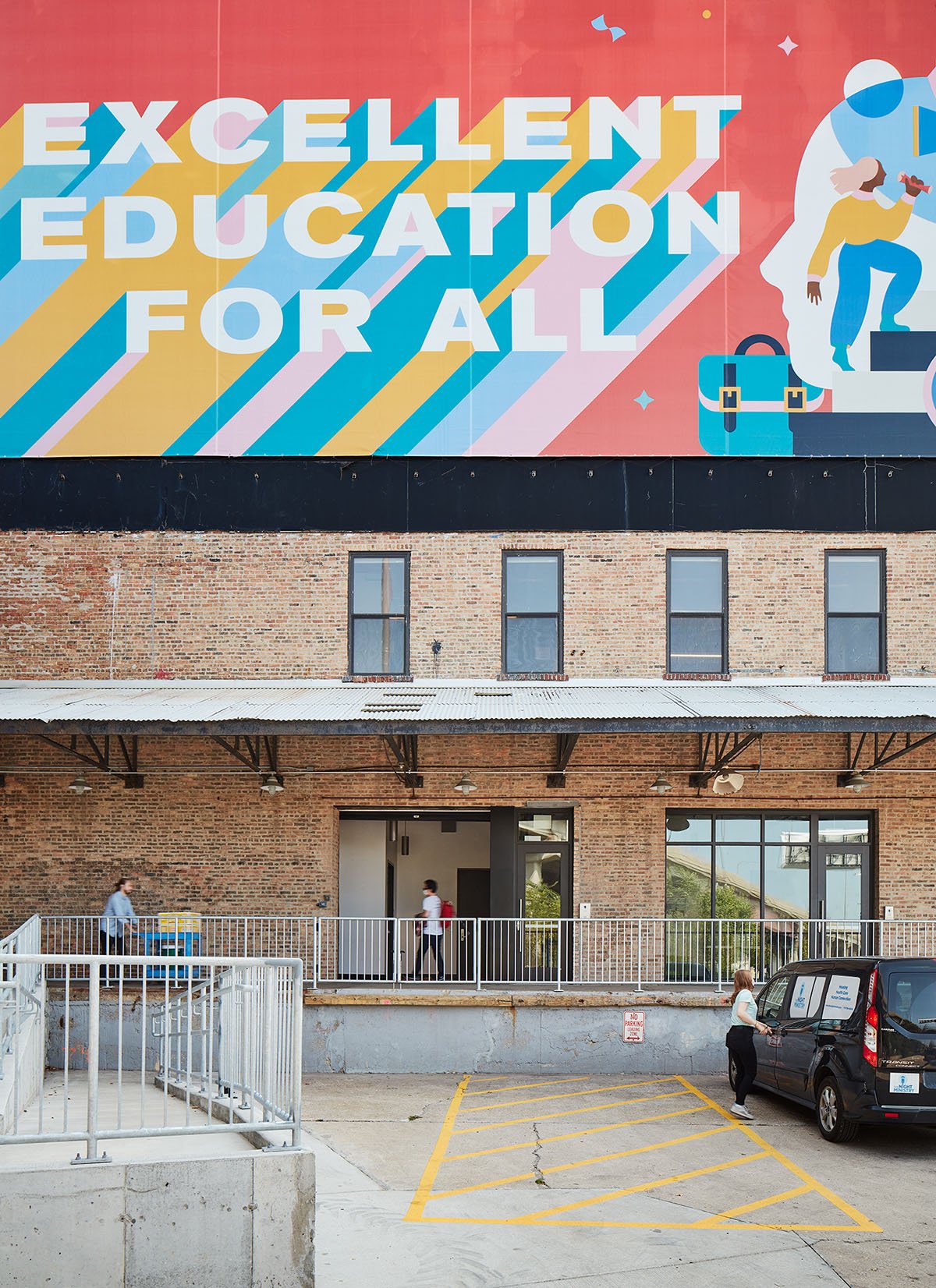 [Text as submitted by architect] Designed for refuge and recovery, The Night Ministry’s new home provides an oasis for security, independence, and safety for young adults facing adversity. The new headquarters is located in the “Mural Building” – a prominent manufacturing building known for its large murals that cover the North, East, and South Elevations along a busy Chicago expressway.