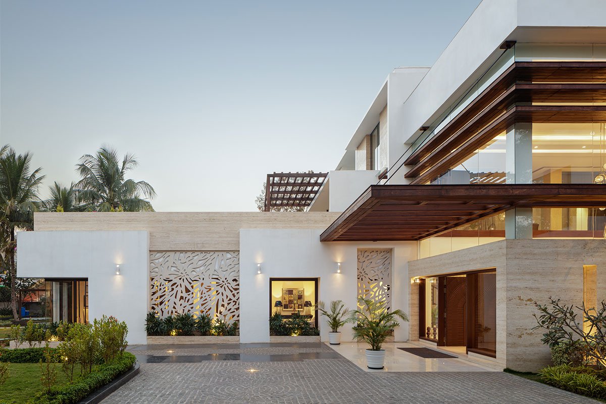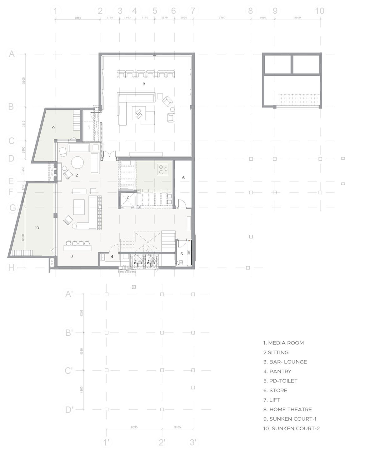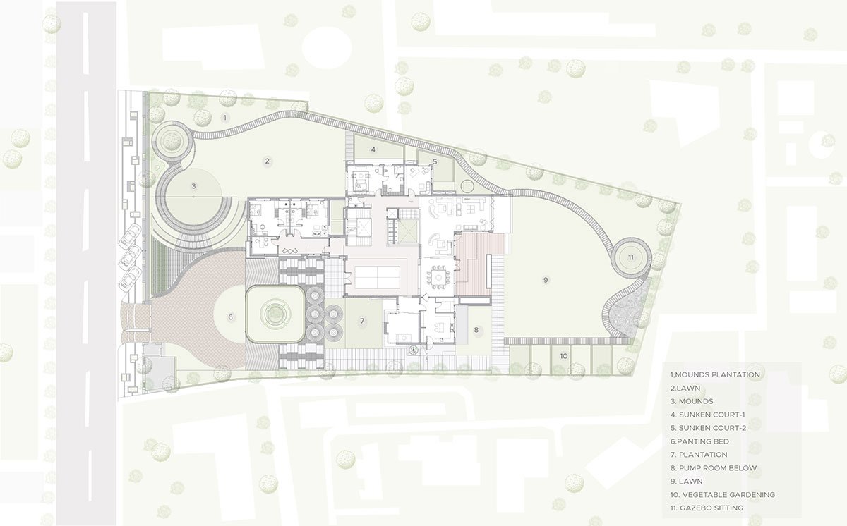 The structure stands above a basement that houses the lounge area. Abundant sunlight is ensured into the basement through a sunken court in the surrounding landscape. The ground floor consists of a bedroom, drawing room, study, dining area, kitchen, and worship room, which surround a double-height living area connected to the guest block through an alleyway. The guest wing serves two bedrooms and office space, and the first floor is occupied by bedrooms for the family. Additionally, the collapsible, dry partition walls offer a high degree of flexibility, creating increased spatial capacity when required. The resultant multi-purpose spaces can be easily converted into a make-shift office or a gym.