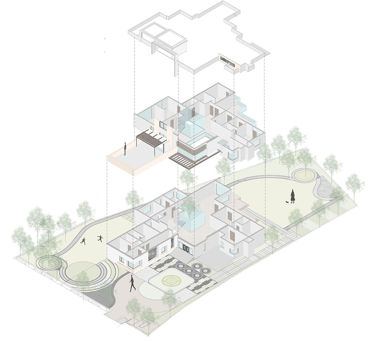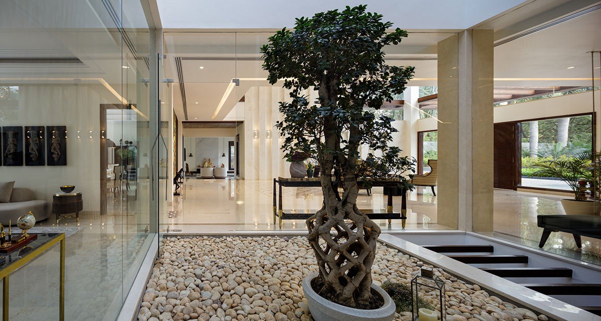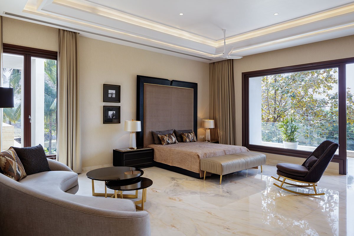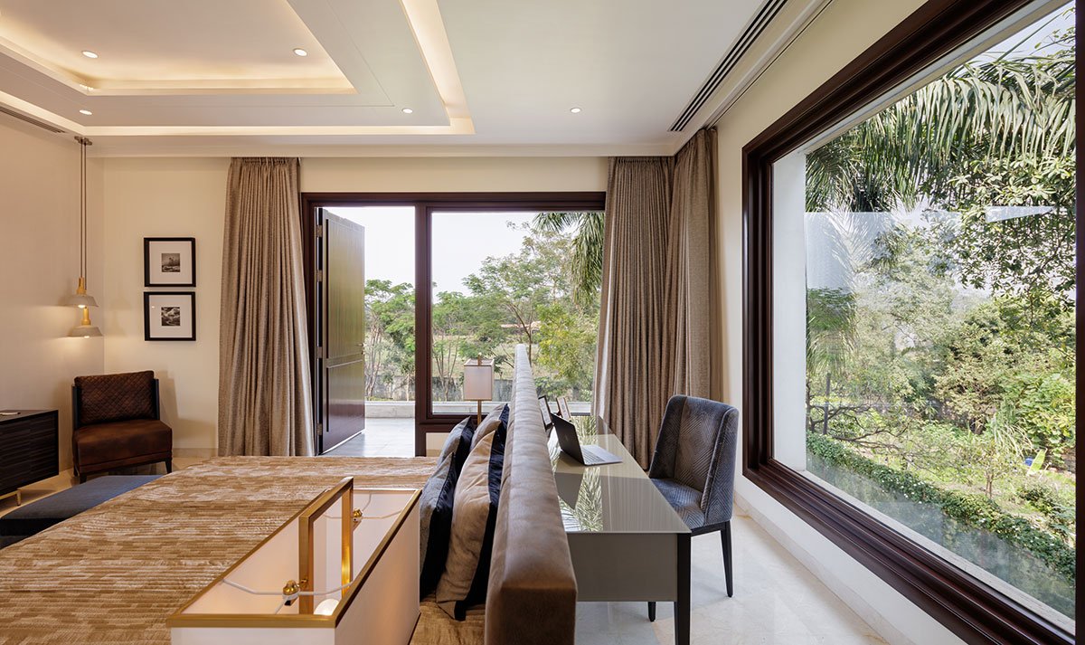 The structure stands above a basement that houses the lounge area. Abundant sunlight is ensured into the basement through a sunken court in the surrounding landscape. The ground floor consists of a bedroom, drawing room, study, dining area, kitchen, and worship room, which surround a double-height living area connected to the guest block through an alleyway. The guest wing serves two bedrooms and office space, and the first floor is occupied by bedrooms for the family. Additionally, the collapsible, dry partition walls offer a high degree of flexibility, creating increased spatial capacity when required. The resultant multi-purpose spaces can be easily converted into a make-shift office or a gym.