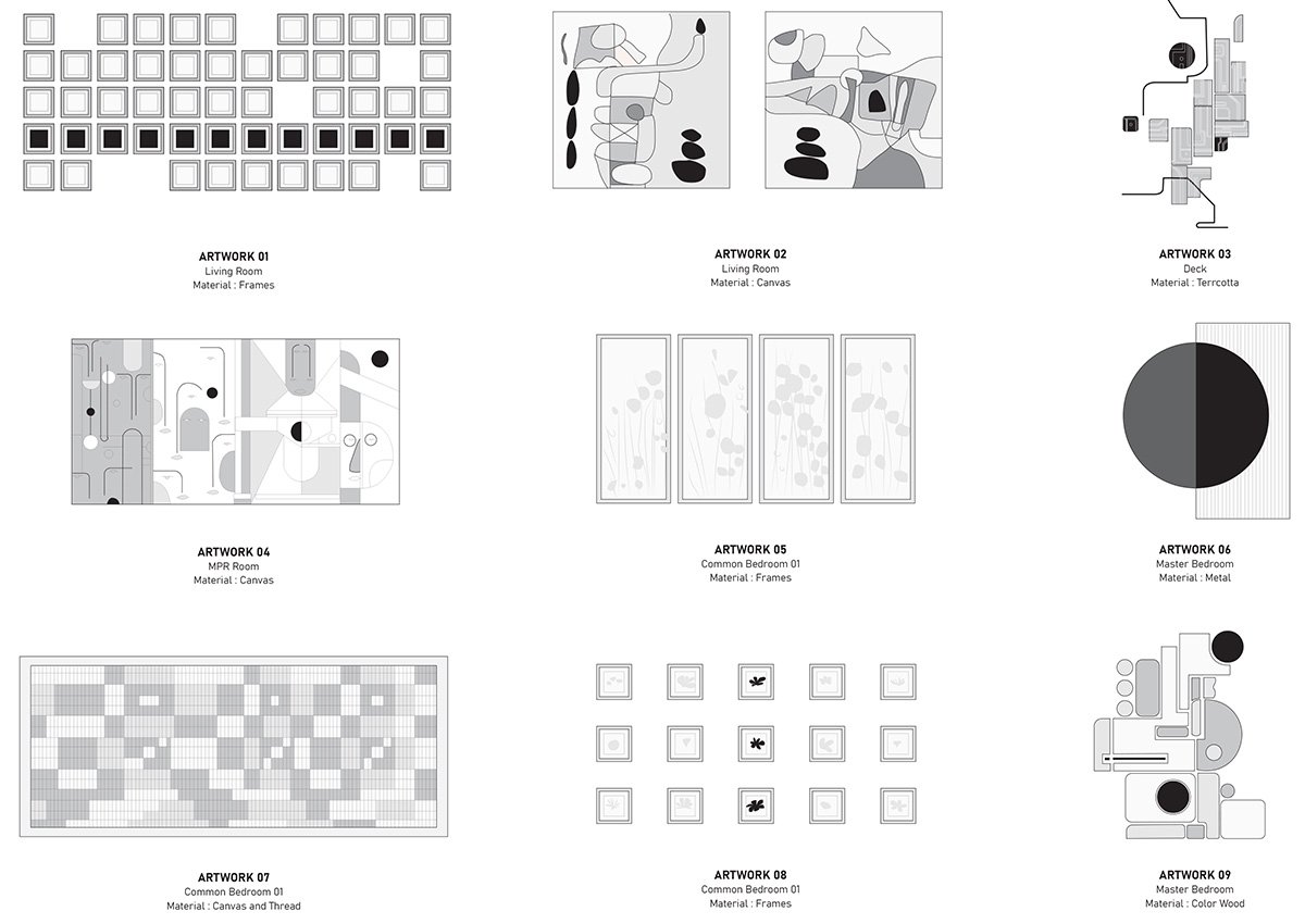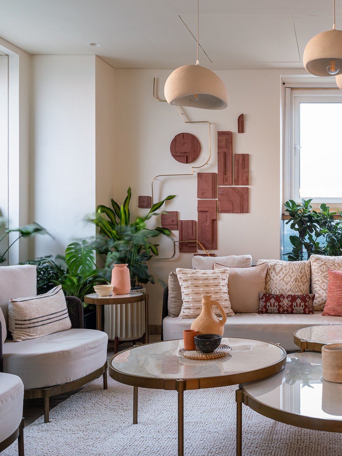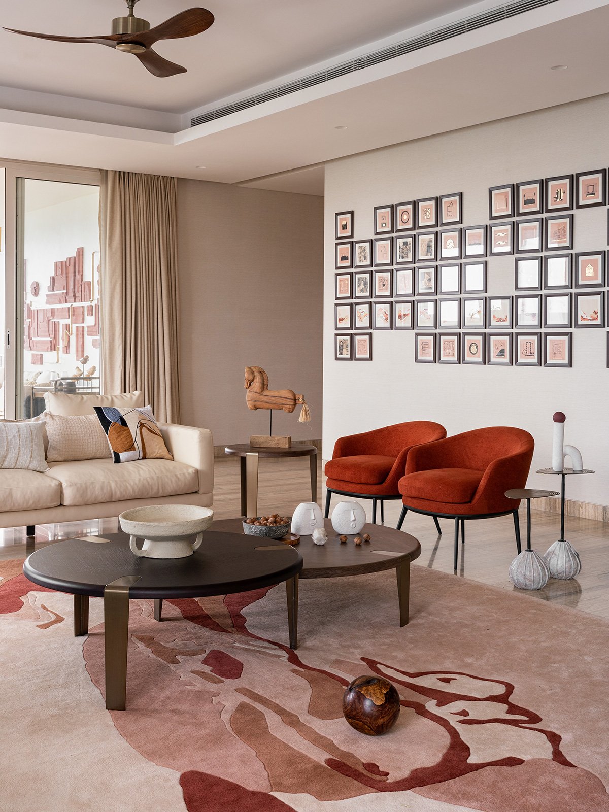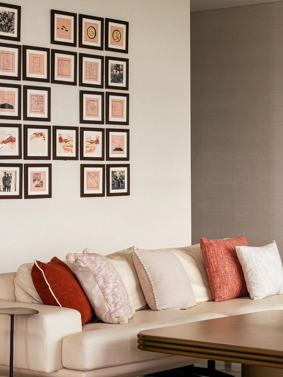 A cohesive palette of warm neutrals dominates the interiors, punctuated by earthy highlights in shades of rust, brown, and Indian red. The living room becomes the heart of the house, where a striking wall installation captures the family’s journey through evocative paintings, maps, and plans from the homes they’ve lived in. Carefully arranged in a grid, the composition features intentional voids, leaving space for framing future memories.