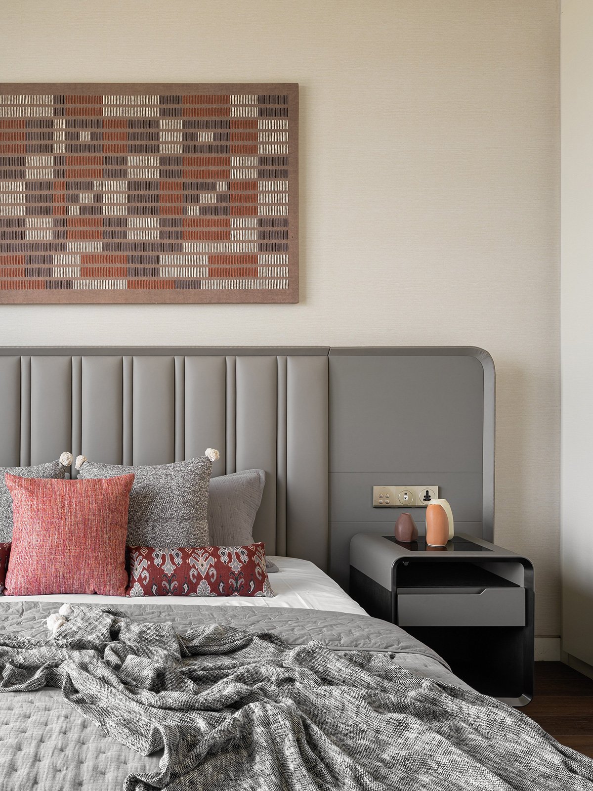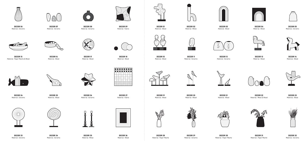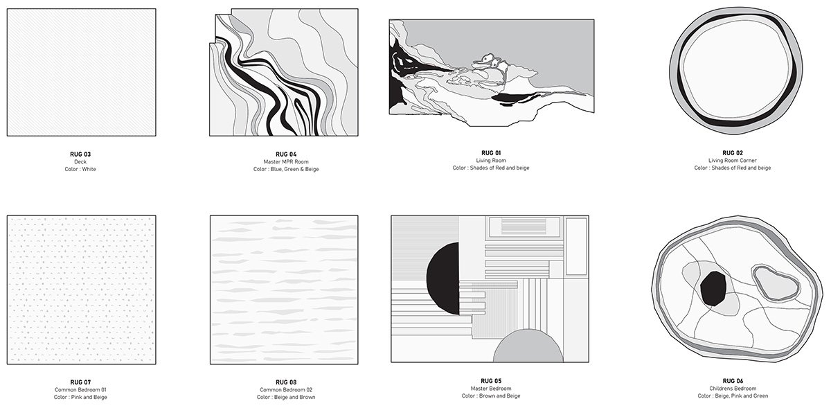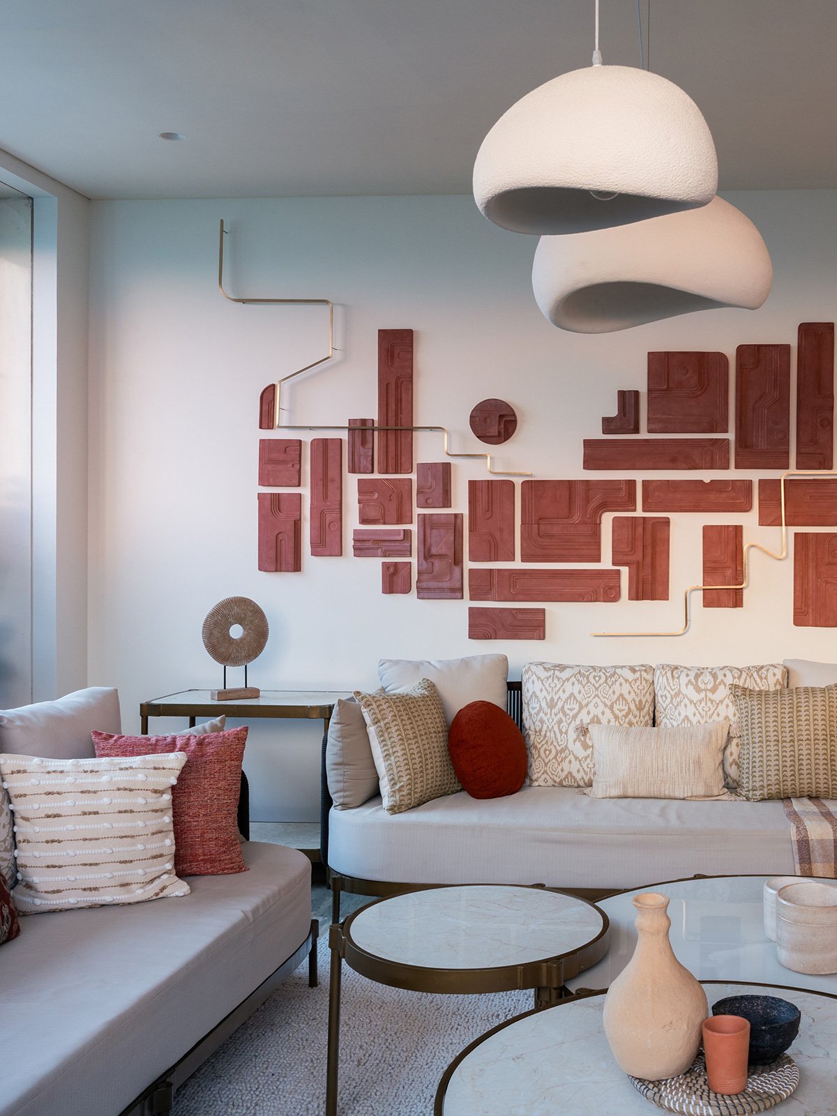 A cohesive palette of warm neutrals dominates the interiors, punctuated by earthy highlights in shades of rust, brown, and Indian red. The living room becomes the heart of the house, where a striking wall installation captures the family’s journey through evocative paintings, maps, and plans from the homes they’ve lived in. Carefully arranged in a grid, the composition features intentional voids, leaving space for framing future memories.