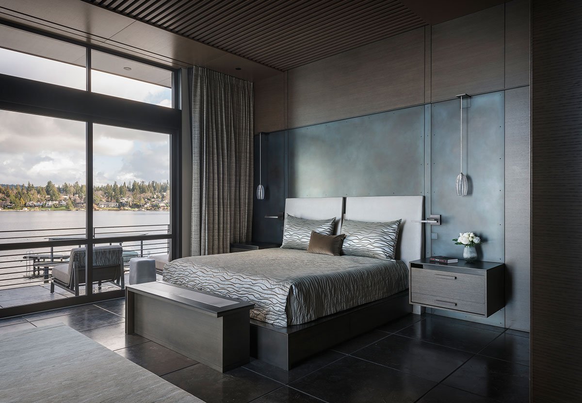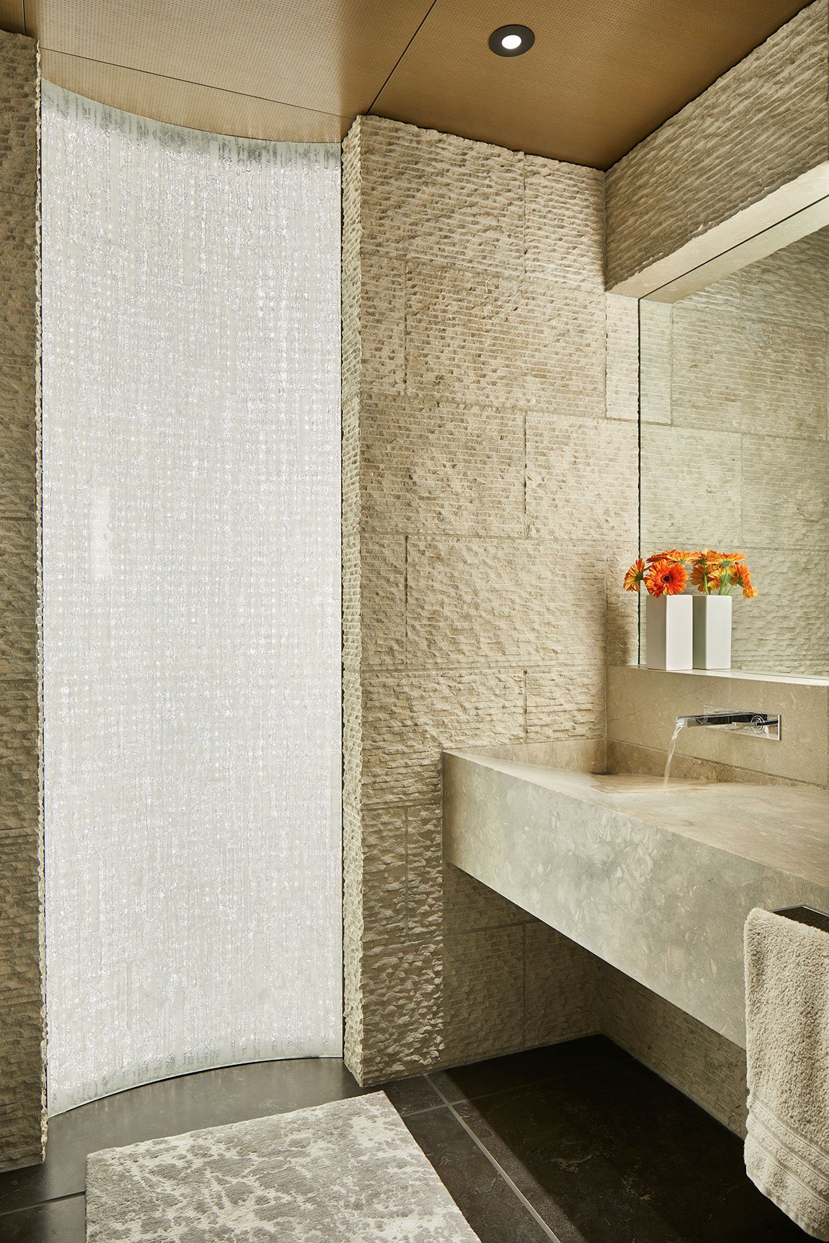 Terraces are positioned adjacent to primary living areas in order to further integrate the buildings to the site. The existing monolithic bulkhead is pierced by three new coves that restore the lakeshore back to its imagined natural beauty which in-turn allows the family to enjoy activities at the water’s edge. A hidden stone patio to the north creates a private space to engage the lakeshore, and two outdoor rooms with fire pits were placed at some distance from the pavilions for the family to enjoy the lake at night.